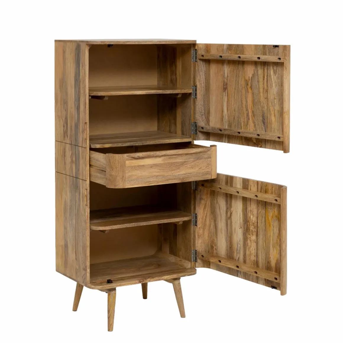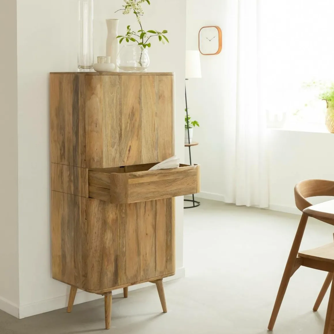 L’armoire Aléna conjugue avec finesse le style scandinave et contemporain. Fabriquée en bois de manguier, elle dispose de deux portes et d’un tiroir central, offrant une solution pratique pour ranger vos affaires essentielles.