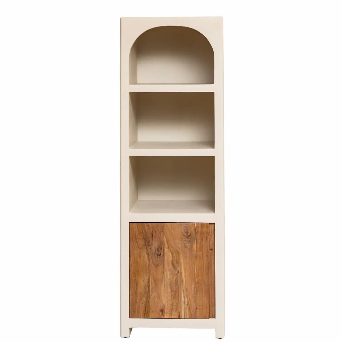L’armoire Dalva combine une porte en bois d’acacia et une structure effet béton, offrant un design contemporain sublimé par une touche méditerranéenne.