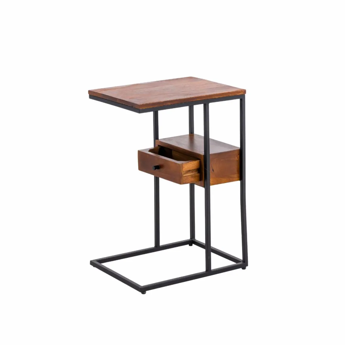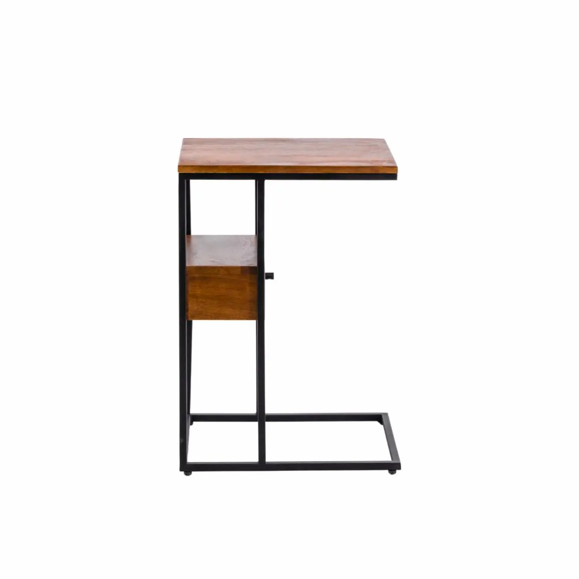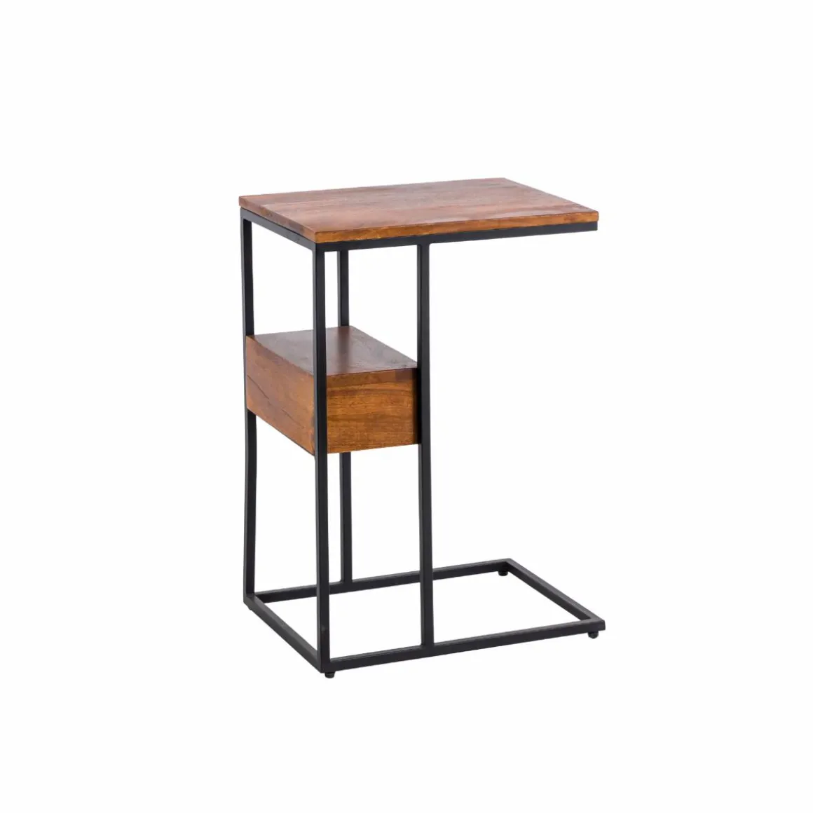 Ce bout de canapé en bois de manguier et métal allie praticité et modernité. Son design en forme de « C » permet de le glisser facilement près d’un canapé ou d’un fauteuil, offrant une surface d’appoint idéale pour poser une tasse, un livre ou un ordinateur. Le mariage du bois de manguier, aux nuances naturelles et chaleureuses, avec la structure métallique noire, apporte une touche industrielle élégante à votre intérieur.