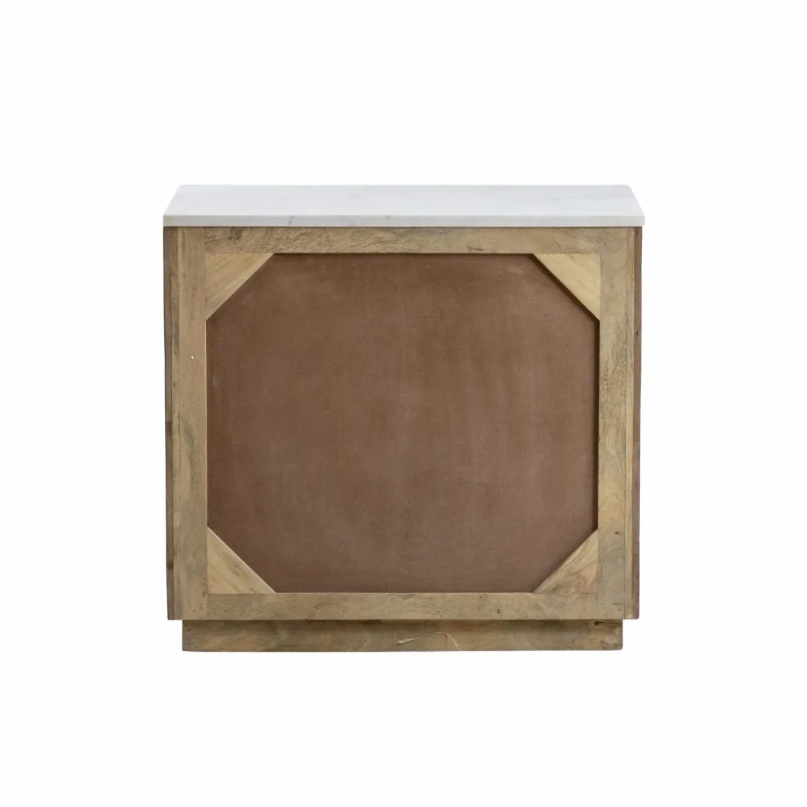 Ce meuble séduit par son alliance raffinée de matières nobles et authentique. Son plateau en marbre apporte une touche élégante et lumineuse, tandis que sa structure en bois de manguier et bois recyclé met en valeur l’authenticité et le charme brut du matériau. Les deux portes vitrées, soulignées par des poignées métalliques noires, offrent un contraste subtil et permettent d’entrevoir vos objets rangés à l’intérieur.
