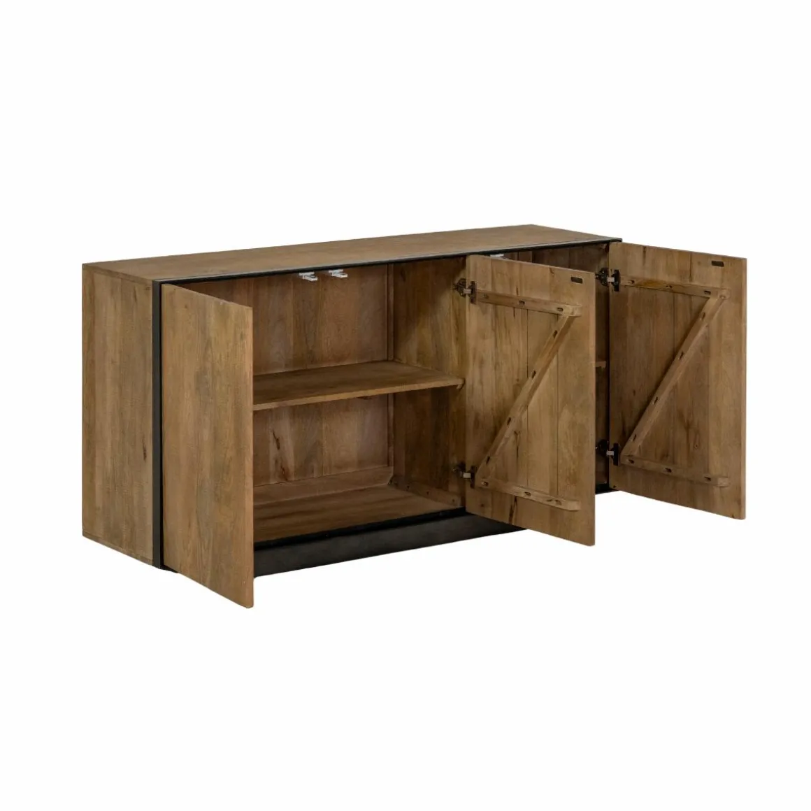 Ce buffet se compose de trois portes dissimulant deux grands compartiments, chacun doté d’une étagère pour une organisation optimale. Vous pourrez y ranger facilement vaisselle, linge de maison ou objets du quotidien. Solide et bien pensé, il se distingue aussi par sa base en métal noir, qui assure stabilité et durabilité.
