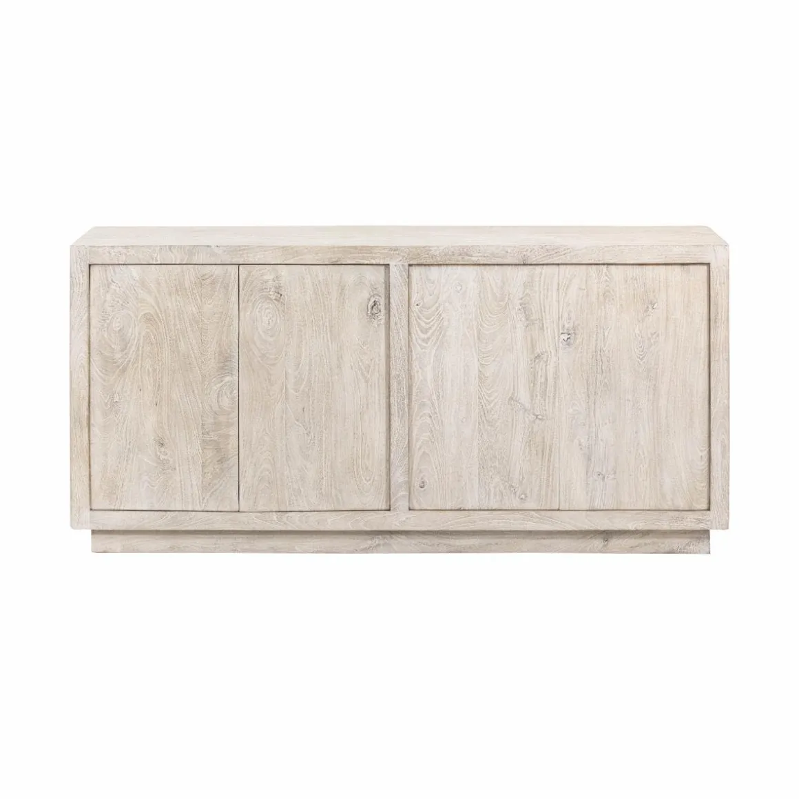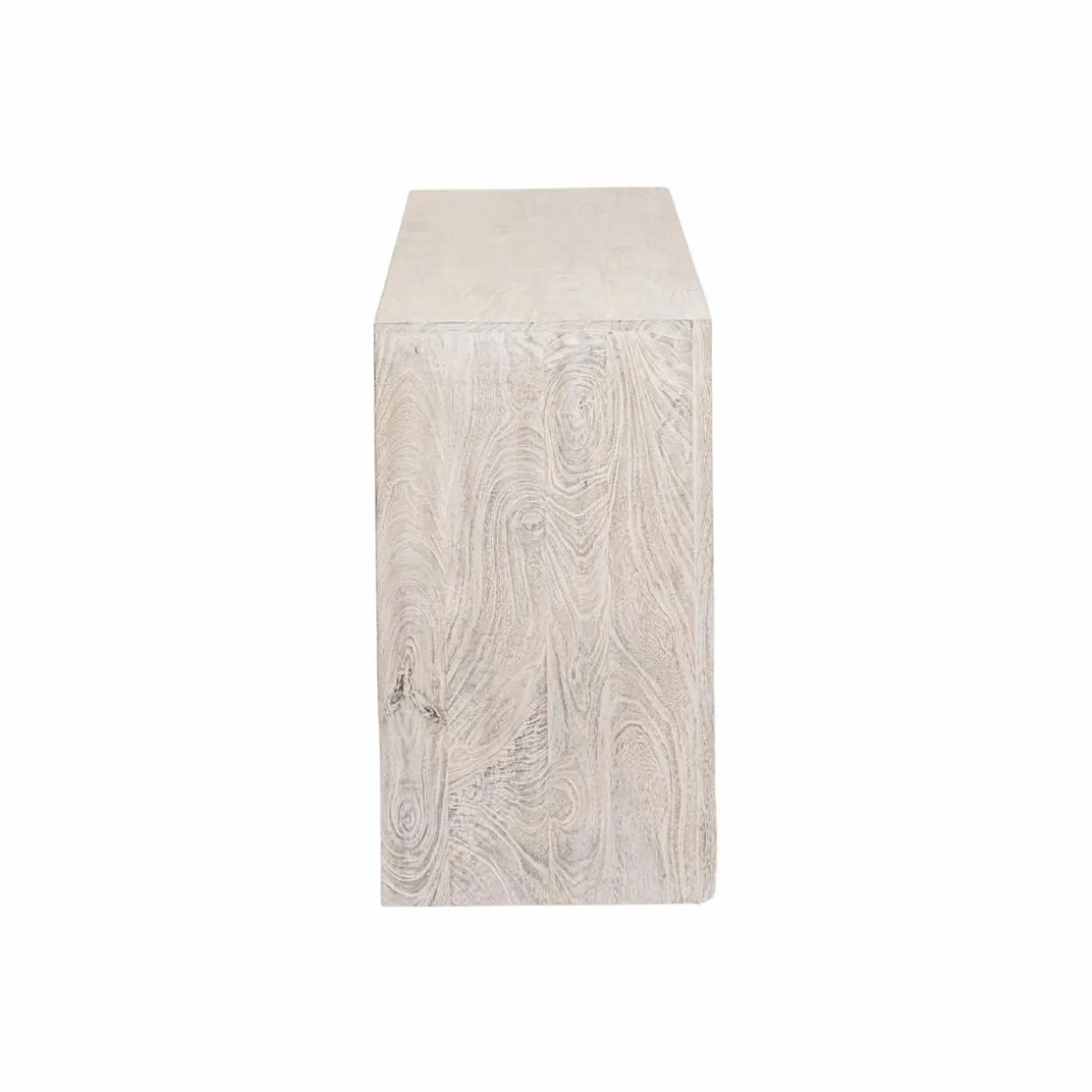 Ce buffet 4 portes en bois de manguier blanchi séduit par son esthétique douce et lumineuse, parfaite pour apporter une touche apaisante et harmonieuse à votre intérieur. Le bois de manguier, reconnu pour ses nuances chaleureuses et ses veines discrètes, est ici subtilement blanchi pour offrir un rendu délicat, à la fois moderne et intemporel.