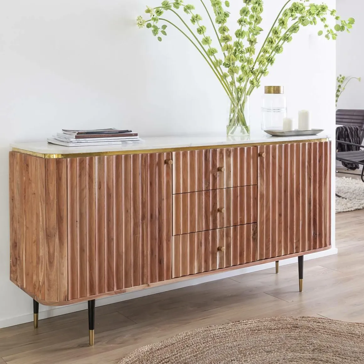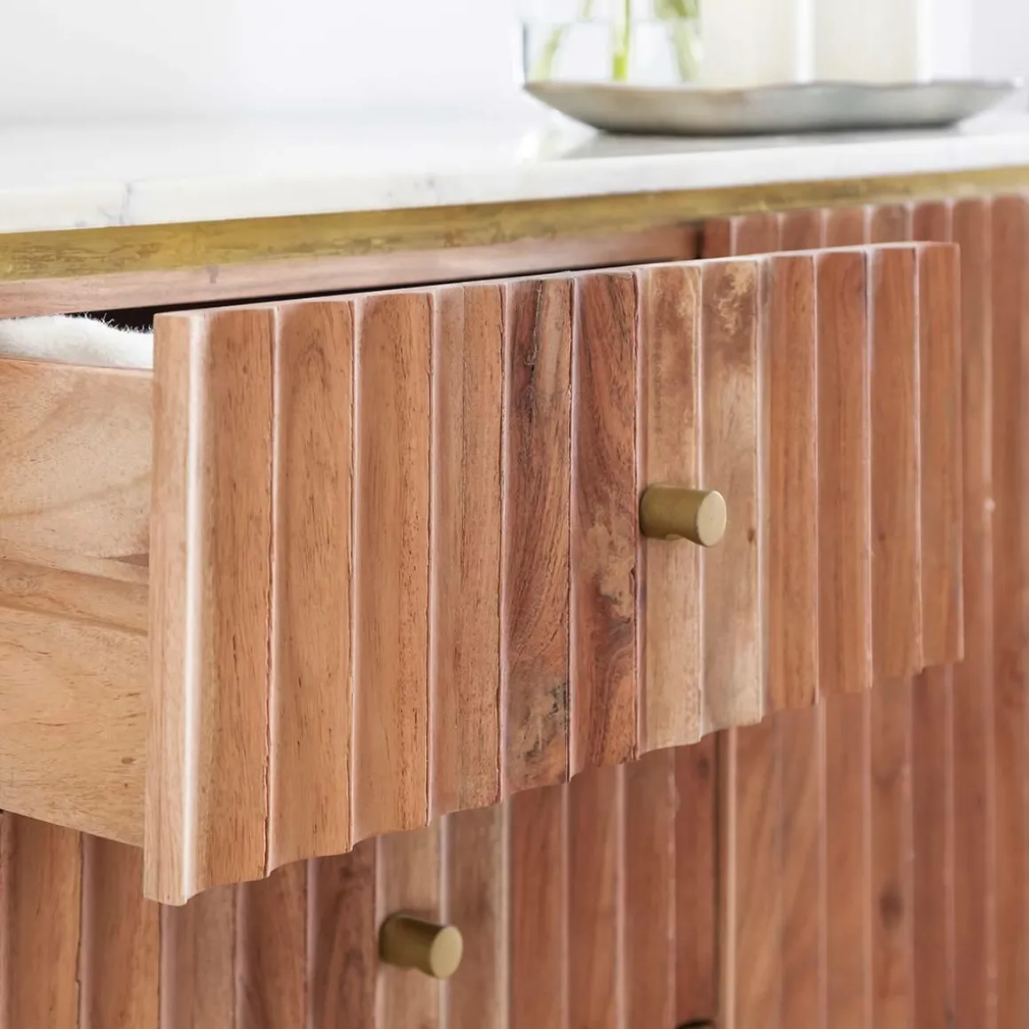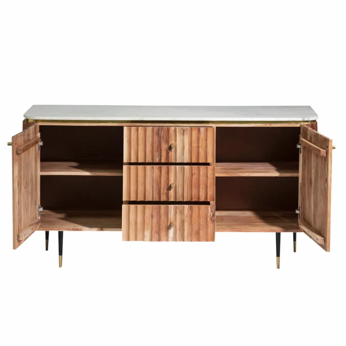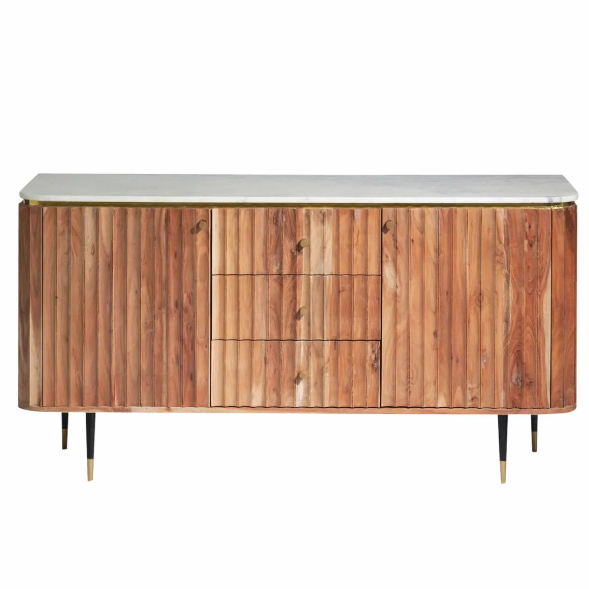 Côté rangement, il vous propose 2 portes derrière lesquelles se cachent un bel espace de rangement organisé à l’aide d’une étagère, ainsi que 3 tiroirs centraux. Le bois d’acacia a été choisi pour sa robustesse et ses nuances lumineuses. Le plateau en marbre affirme le côté intemporel du meuble et en fait un indispensable qui se transmettra de générations en générations.