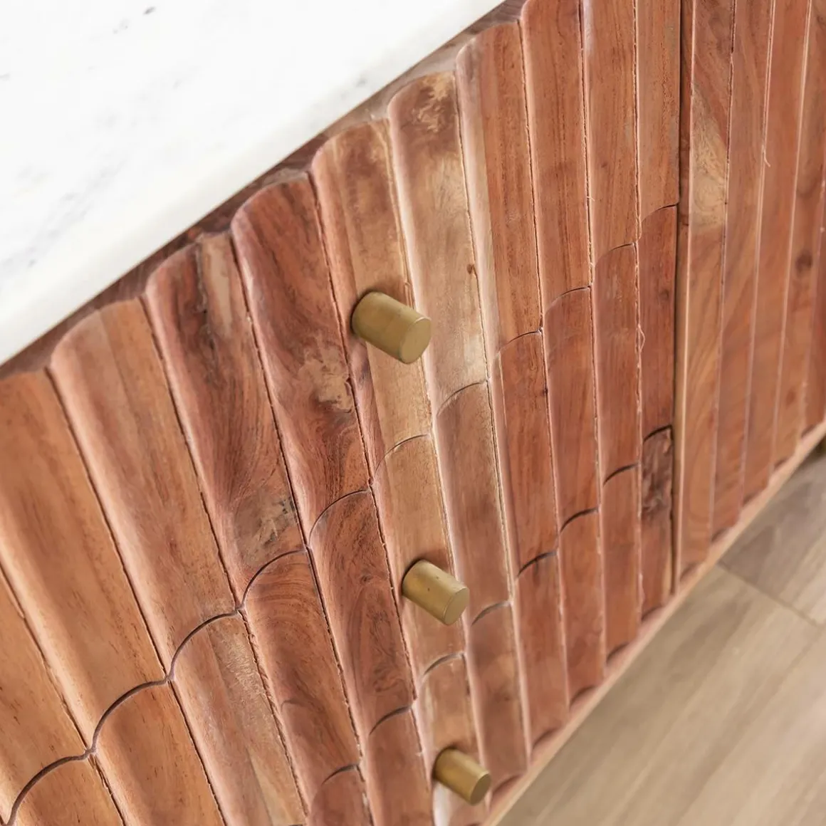 Le coup de cœur de l’équipe : Le marbre blanc, on adore. Le bois sculpté, ça change, ça marque la différence et on est fan. Les petits retours en laiton sur le piétement, c’est chic et ça s’associe super bien avec les autres matériaux, on valide. En bref, un trio gagnant qui a mis toute l’équipe d’accord !