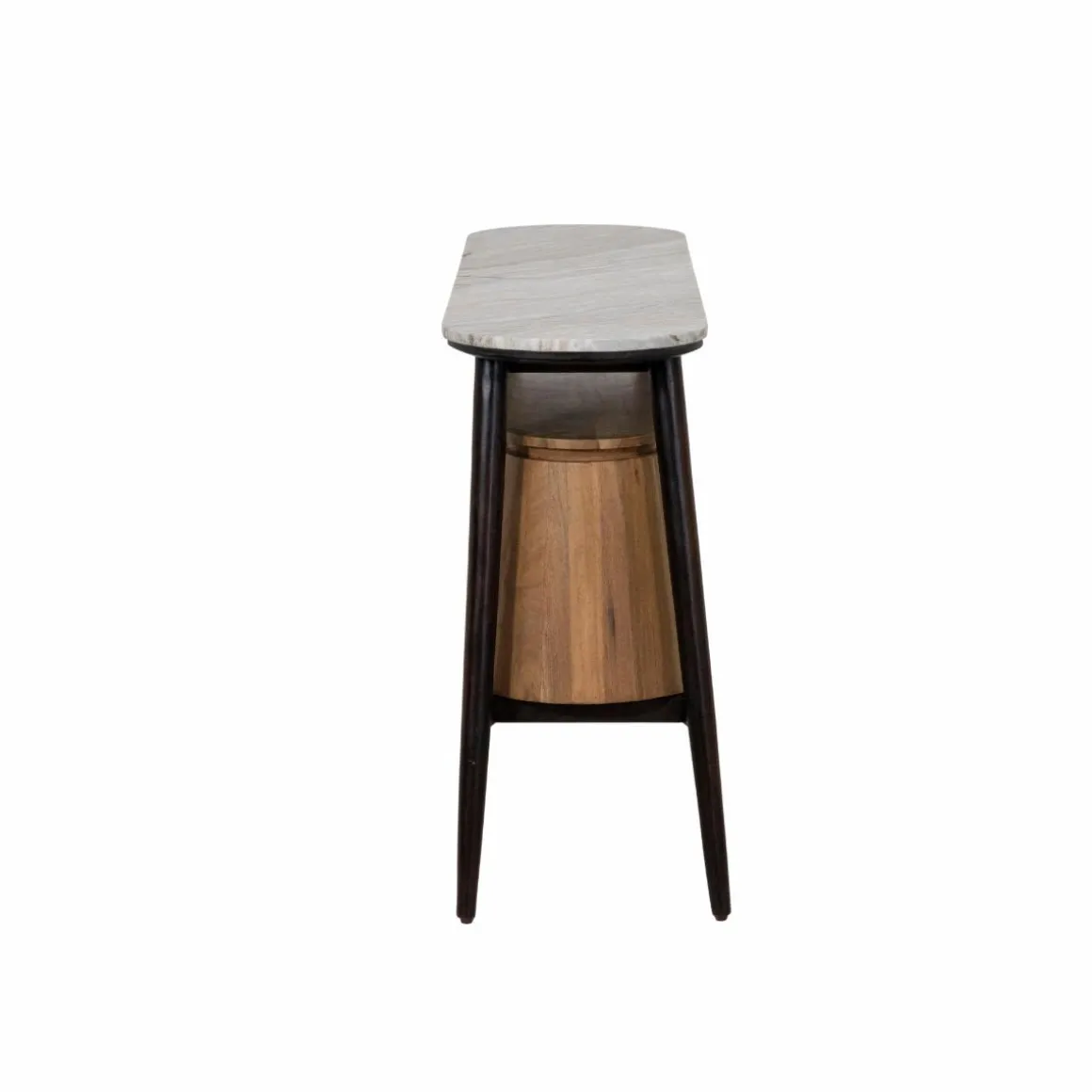 Ce buffet en bois d’acacia, métal et marbre séduit par son design audacieux et sa composition de matières nobles. Le veinage riche et chaleureux du bois d’acacia contraste élégamment avec la finesse du piètement en métal noir et l’éclat sophistiqué du plateau en marbre. L’ensemble, aux lignes arrondies et à la silhouette élancée, apporte une vraie touche d’élégance contemporaine à votre intérieur.