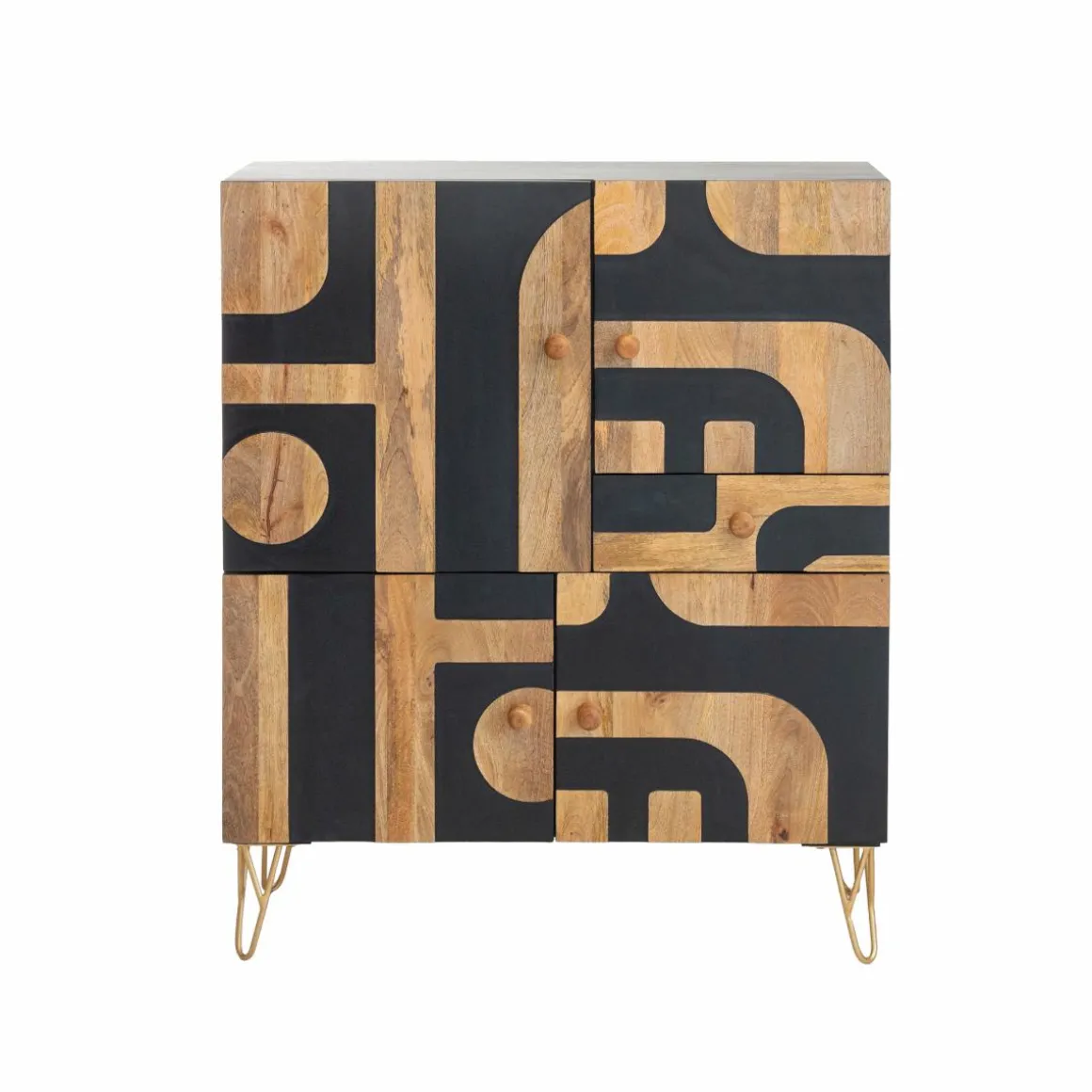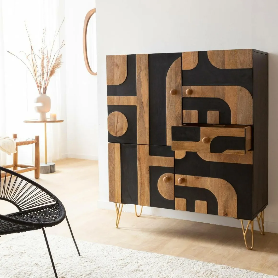 Avec une hauteur de 120 cm et une largeur de 100 cm, il offre cinq espaces de rangement distincts derrière des portes ornées de charmants motifs géométriques noirs. Son design contemporain et élégant en fait le complément idéal pour améliorer votre décoration intérieure et ajouter de la sophistication à n’importe quel espace.