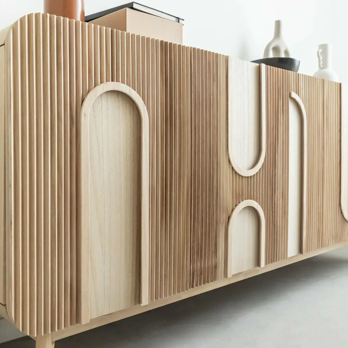 Ce buffet en bois de paulownia de la collection Nilo allie légèreté visuelle et originalité artistique. Sa teinte claire et lumineuse illumine l’espace, tandis que les motifs sculptés en relief sur les portes apportent une dimension graphique et contemporaine à ce meuble au charme singulier.