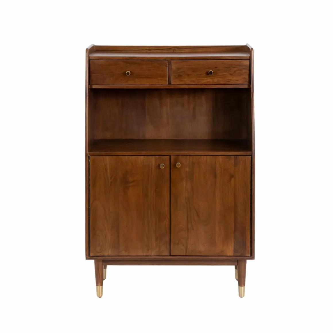 Ce meuble de rangement se compose de deux tiroirs supérieurs, d’une niche centrale ouverte idéale pour exposer verrerie ou objets déco, et d’un compartiment bas fermé par deux portes. Les poignées rondes dorées ajoutent une note chic à l’ensemble, contrastant avec la chaleur du bois d’acacia.