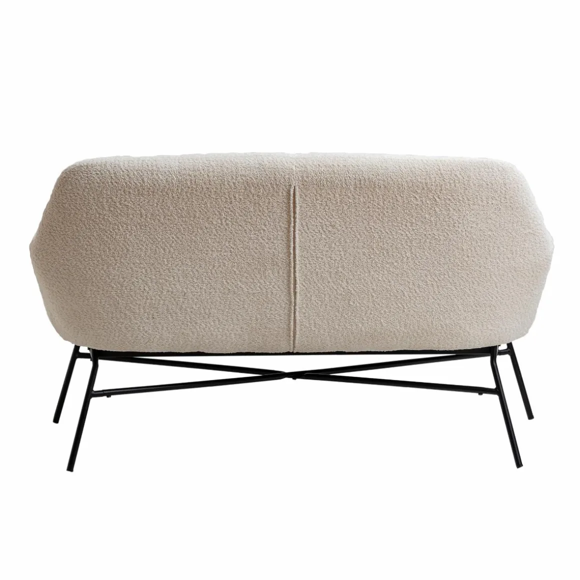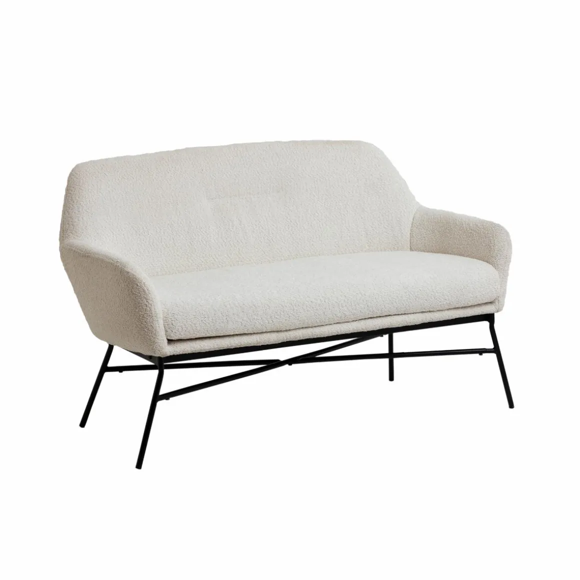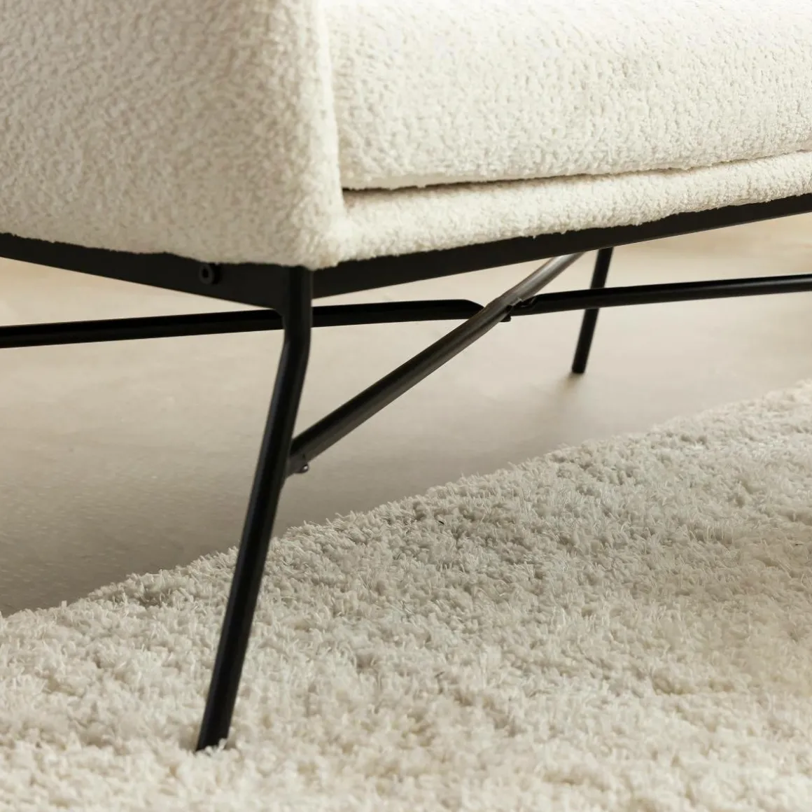 Le canapé Amandine, avec son revêtement en tissu bouclette blanc et sa structure en métal noir, combine parfaitement confort et style.
