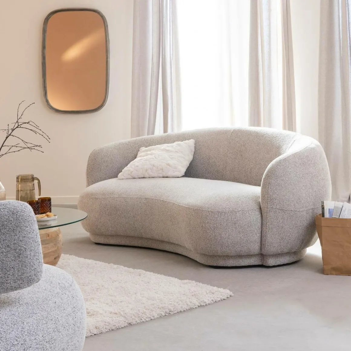 Adoptez une ambiance douce et enveloppante avec le canapé Maddy en tissu bouclette gris. Véritable coup de cœur design, ce canapé 3 places se distingue par ses courbes harmonieuses et son revêtement texturé ultra cosy, parfait pour sublimer un intérieur contemporain.