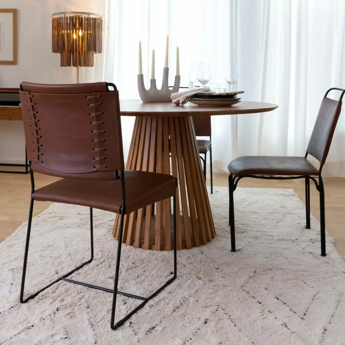 Cette belle pièce présente une assise et un dossier en cuir marron, rehaussés d’une couture tressée apparente derrière le dossier. Soutenue par une structure en métal noir, sa forme profilée la rend à la fois élégante et confortable. De dimensions généreuses – 86 cm de hauteur et 46 cm de largeur – la chaise Valéria est non seulement accueillante, mais aussi remarquablement robuste.