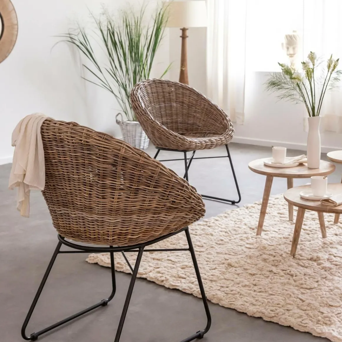 Cette belle chaise en rotin, avec sa base métallique élégante, présente une forme arrondie et un style bohème. Avec une hauteur de 90 cm, une largeur de 74 cm et une profondeur de 76 cm, cette pièce est à la fois élégante et confortable, tout en ajoutant une dimension et une classe à n’importe quel espace.