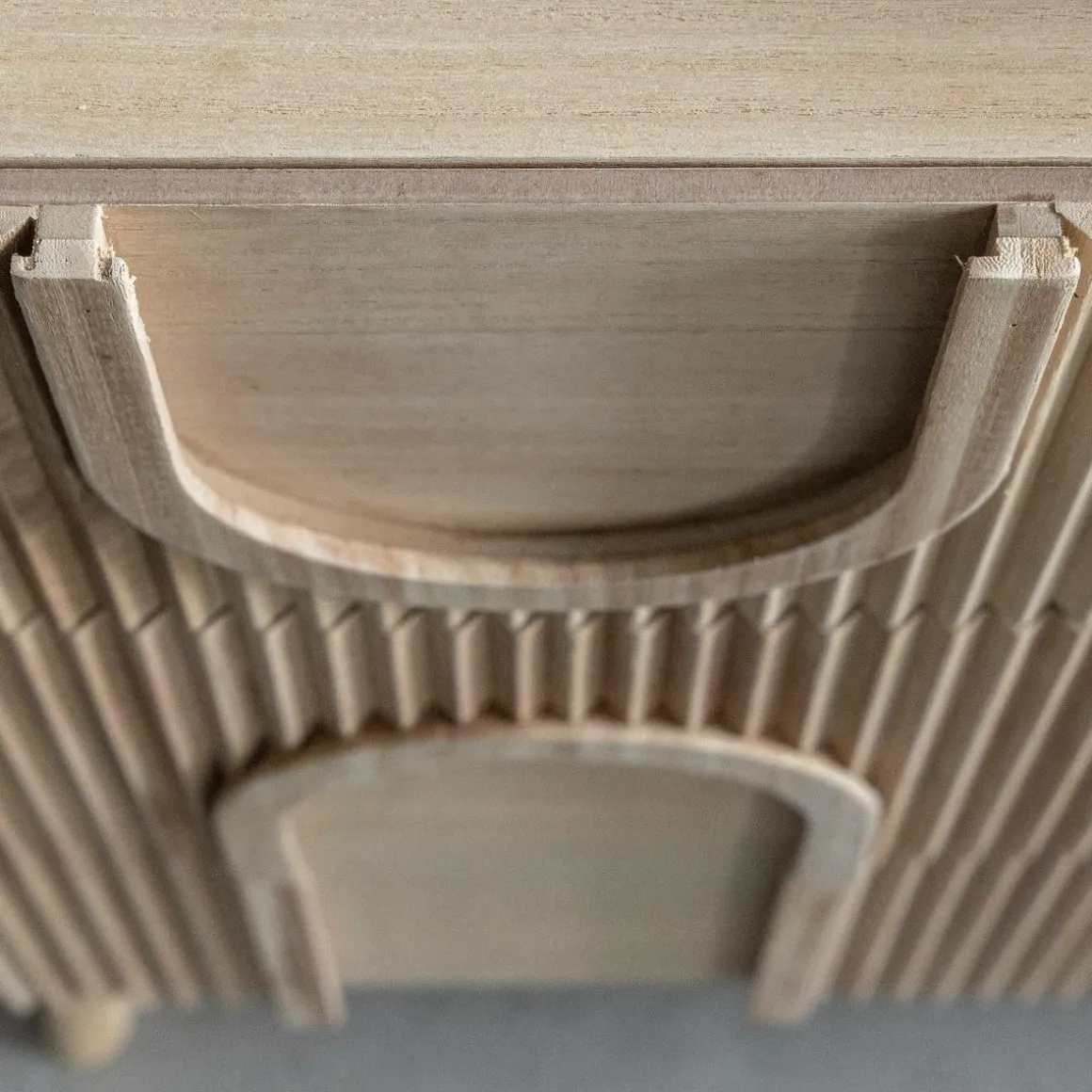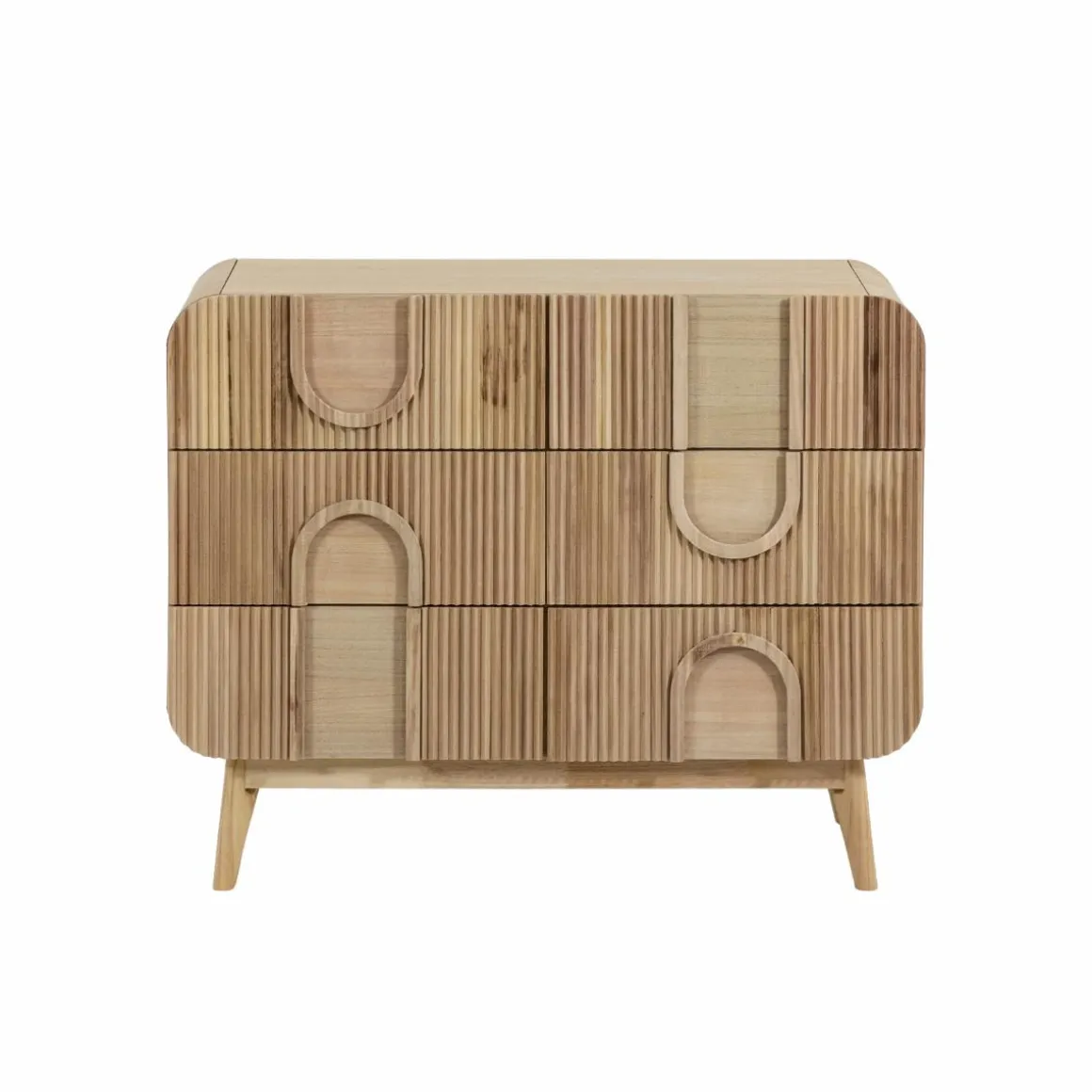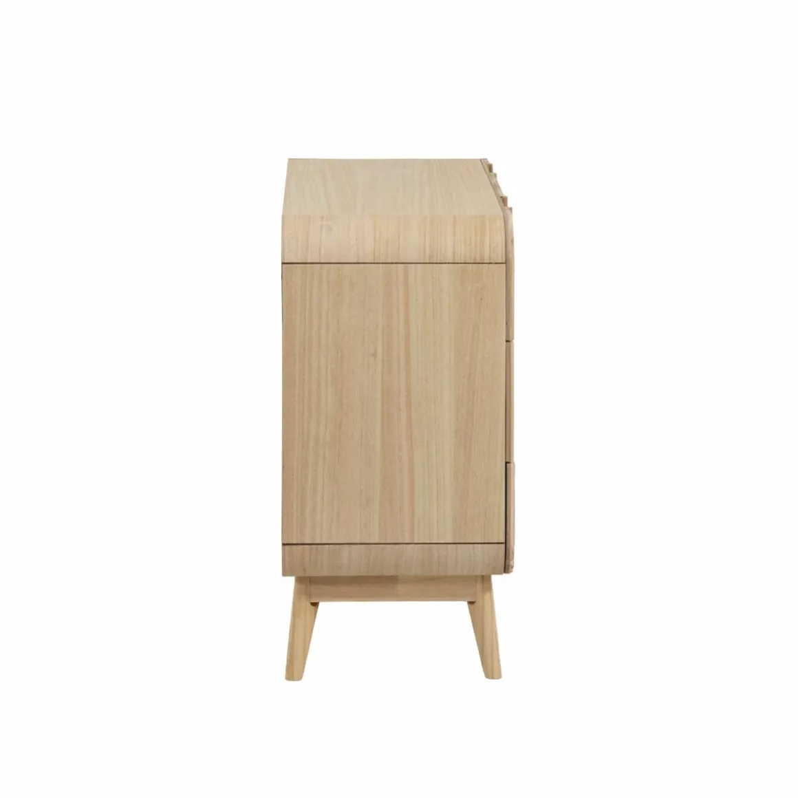 Apportez une note douce et contemporaine à votre intérieur avec la commode Nilo, un meuble en bois de paulownia reconnu pour sa légèreté et sa teinte lumineuse. Son design sculptural, marqué par des motifs en relief et des courbes arrondies, en fait une pièce décorative à part entière.