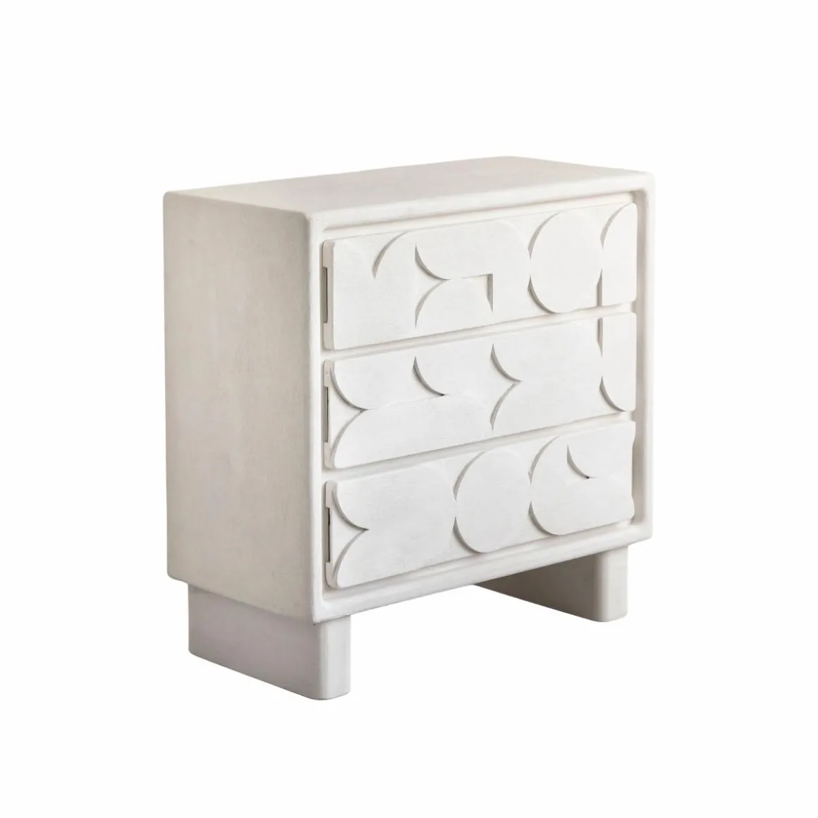 Cette commode de la collection Danaé transforme un meuble du quotidien en véritable pièce artistique. Elle séduit immédiatement par sa façade sculptée en motifs géométriques en relief, aux formes arrondies, presque hypnotiques, qui se dessinent sur chacun de ses trois tiroirs. Un jeu graphique qui attire la lumière et crée un effet de texture vivant.