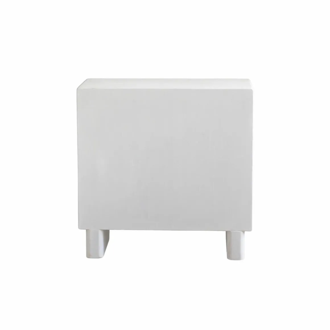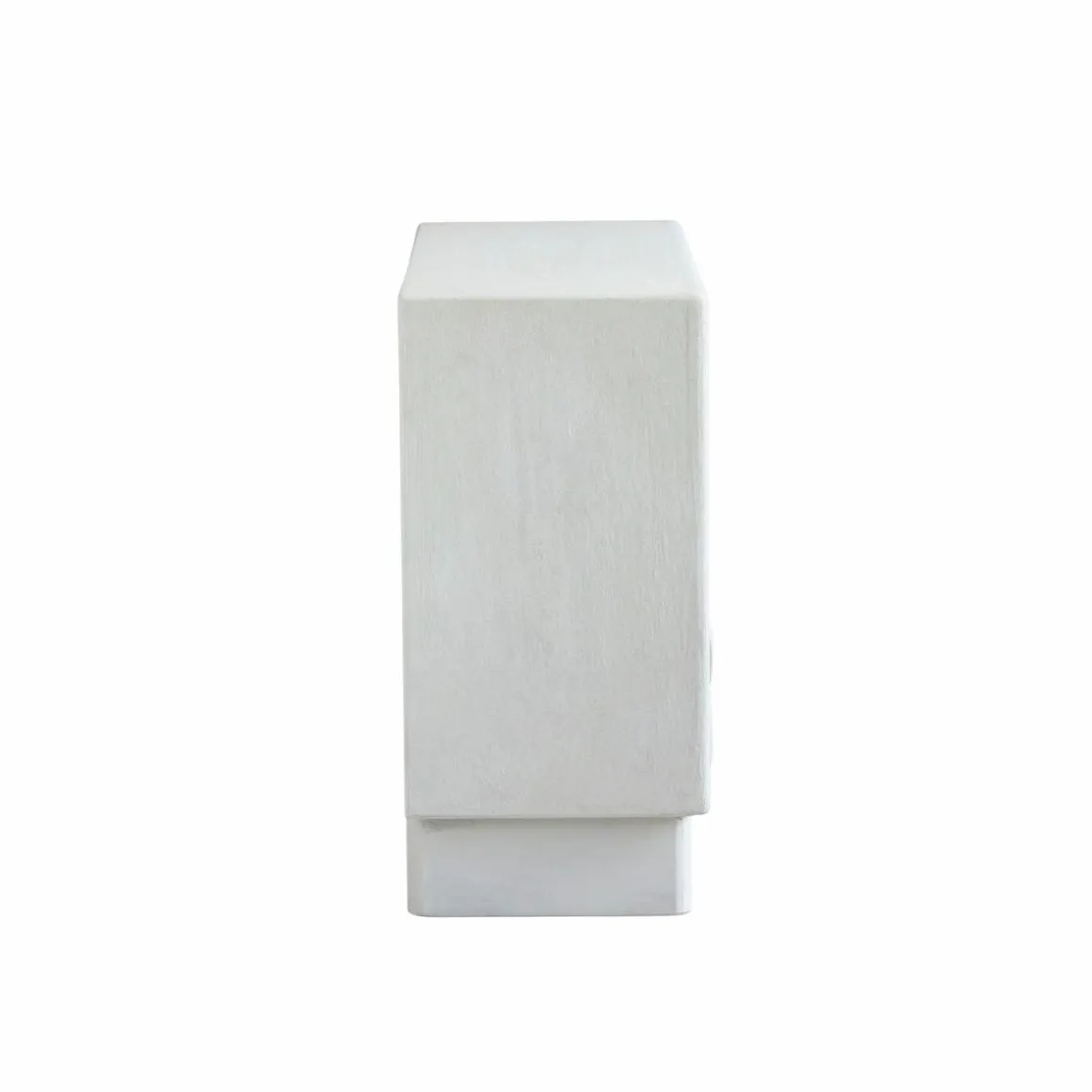 Conçue en polyrésine blanche, elle arbore une finition mate, légèrement grainée, évoquant une matière minérale. Compacte mais généreuse, elle offre trois grands tiroirs de rangement pratiques pour accueillir linge, documents ou objets personnels. Le tout est monté sur quatre pieds cylindriques qui rehaussent l’ensemble et allègent visuellement la structure.