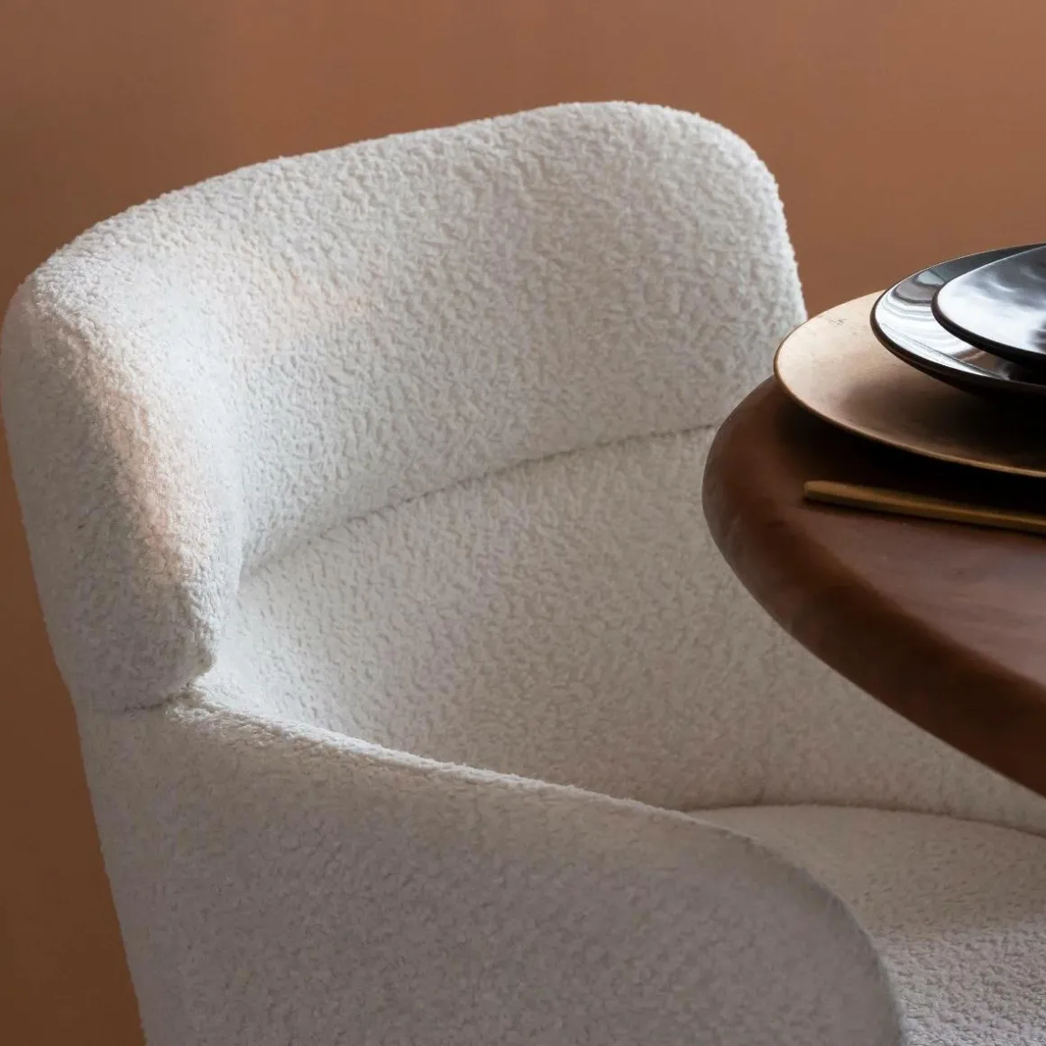 Le fauteuil Valentin, en tissu bouclette blanc, séduit par son design moderne et élégant.