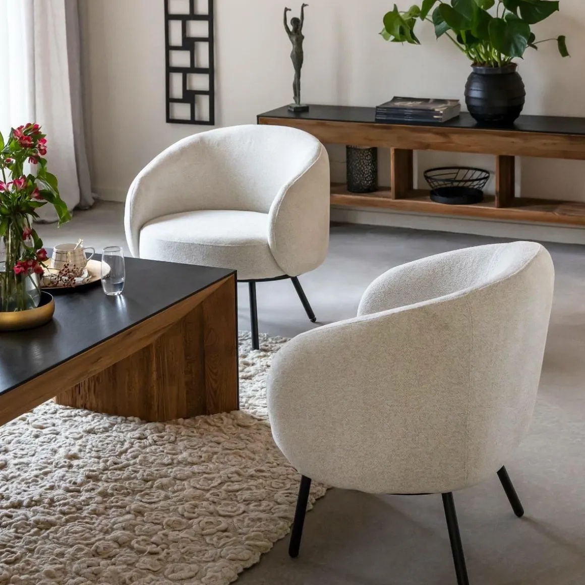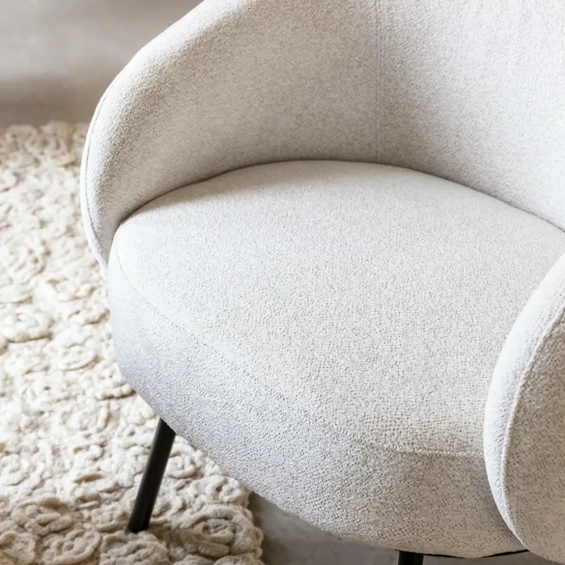 Revêtu d’un tissu bouclette blanc, il apporte une touche de douceur et de modernité grâce à sa texture chaleureuse. Son assise et son dossier épais offrent un confort optimal, idéal pour se détendre après une longue journée.