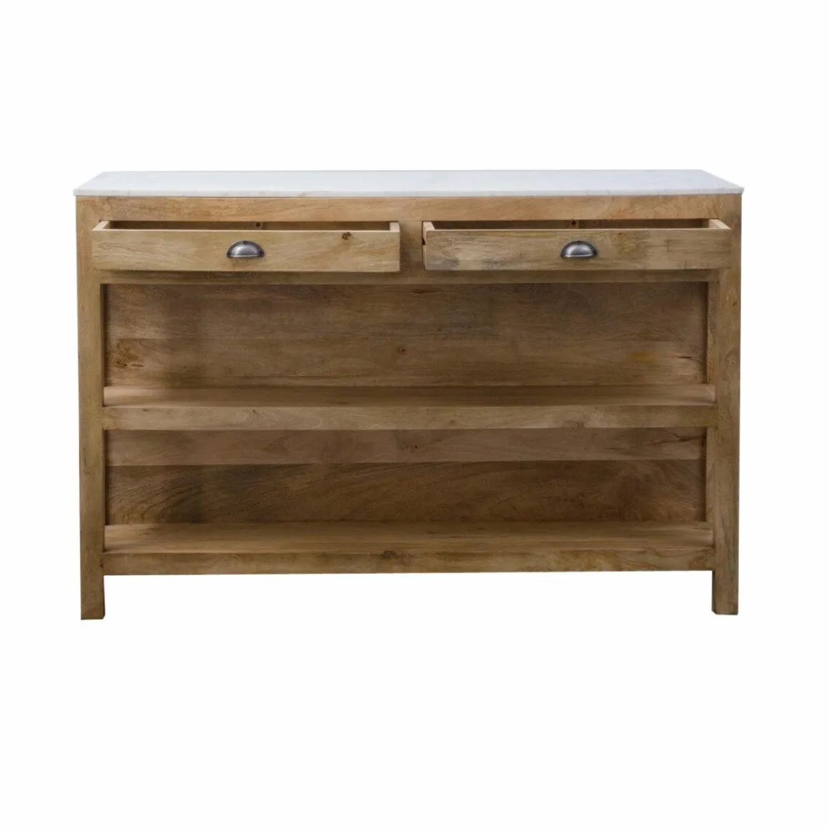 Vous allez adorer les dimensions optimales de ce meuble qui vous offrira de nombreux espaces de rangement, à savoir deux tiroirs mais aussi deux niches. Vous pourrez y déposer votre vaisselle par exemple. L’alliance entre le bois et le marbre également une touche de modernité à ce meuble.