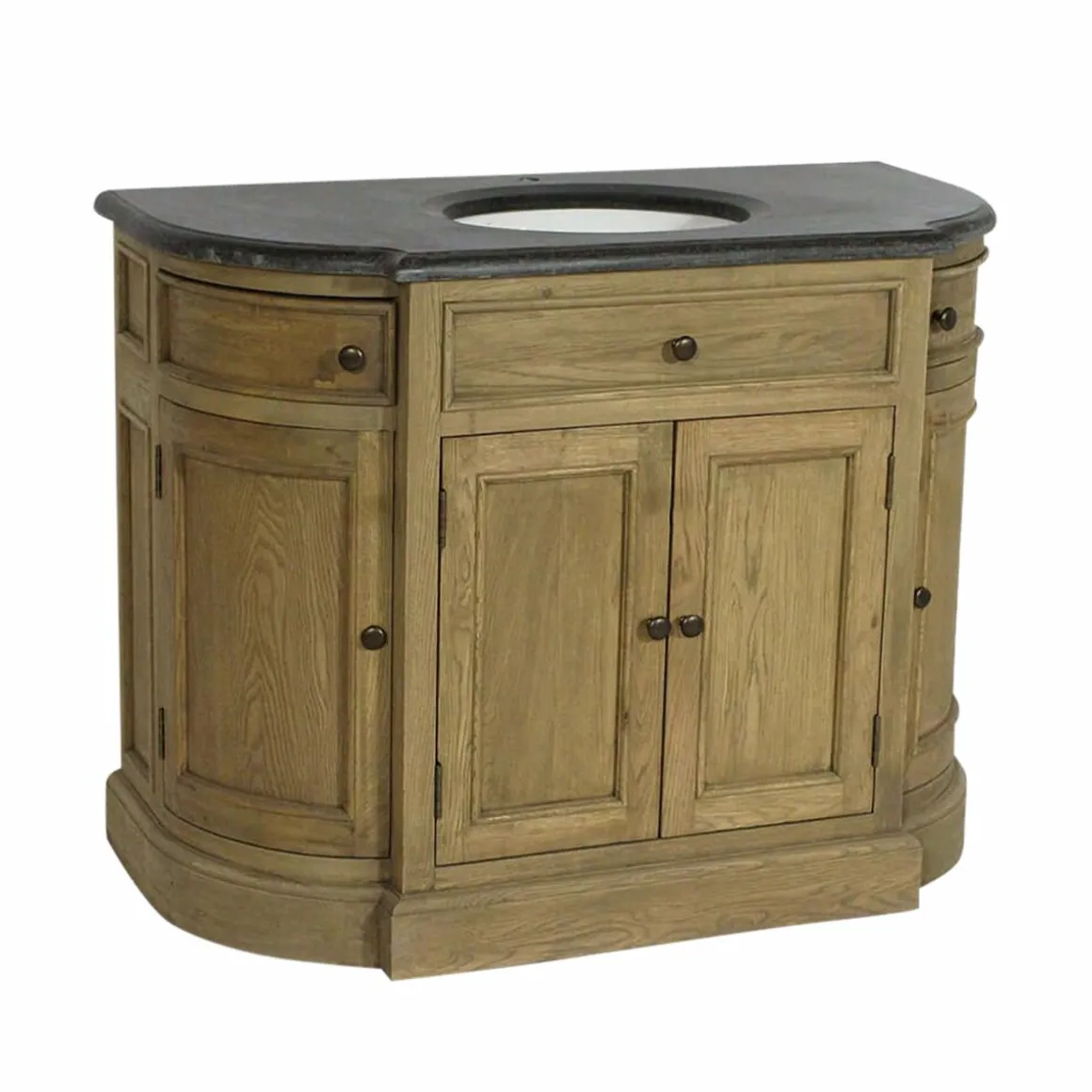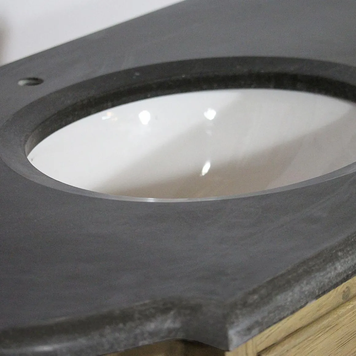 Ce meuble salle de bain est fourni avec sa vasque. Livré en 2 parties : partie basse + plateau en pierre bleue de Chine avec vasque intégrée. Diamètre robinet : 3.5cm – Diamètre de la bonde 40 mm -trop plein.
