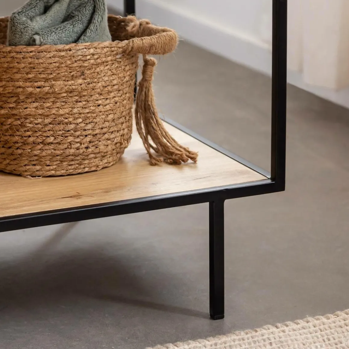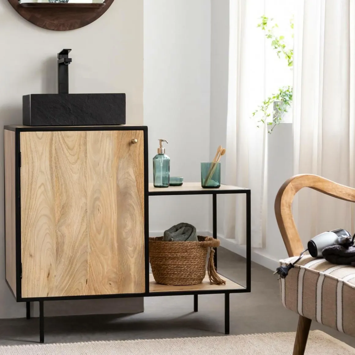 Côté esthétique ; c’est le bois de manguier qui a été choisi pour concevoir ce meuble. En effet, c’est un bois lumineux qui résiste très bien aux variations de température, il est donc parfait pour une pièce comme la salle de bain. L’association avec le métal noir est très bien dosé. C’est doux, c’est original, c’est moderne.