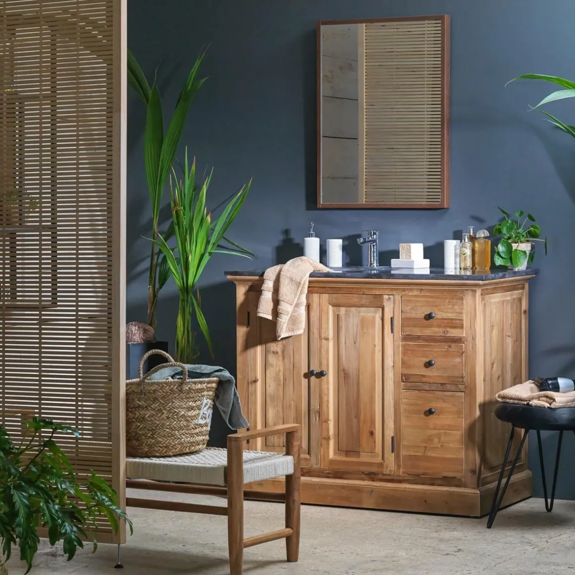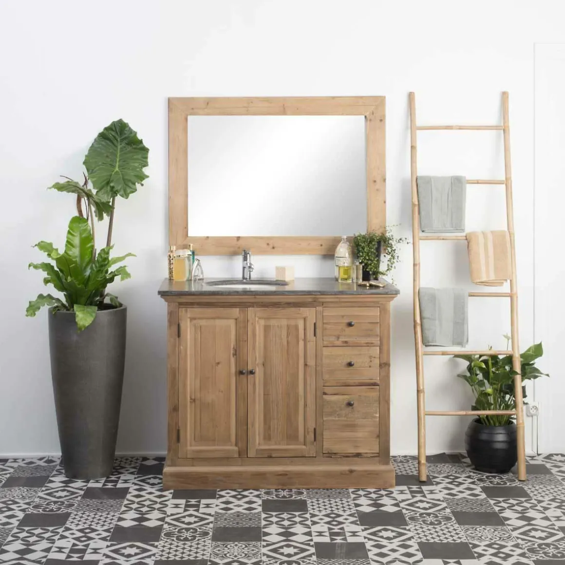Appréciez le charme et l’authenticité de ce meuble de sous vasque bois massif. Composé en bois recyclé, ce meuble dispose d’un plateau en pierre bleue de Chine et d’une vasque encastrable. Laissez régner une atmosphère zen et apaisante au sein de votre salle de bain en optant pour du mobilier en bois recyclé. A la fois pratique et élégant, ce meuble saura apporter un certain charme grâce à l’alliance du pin recyclé et de la pierre bleue de Chine.