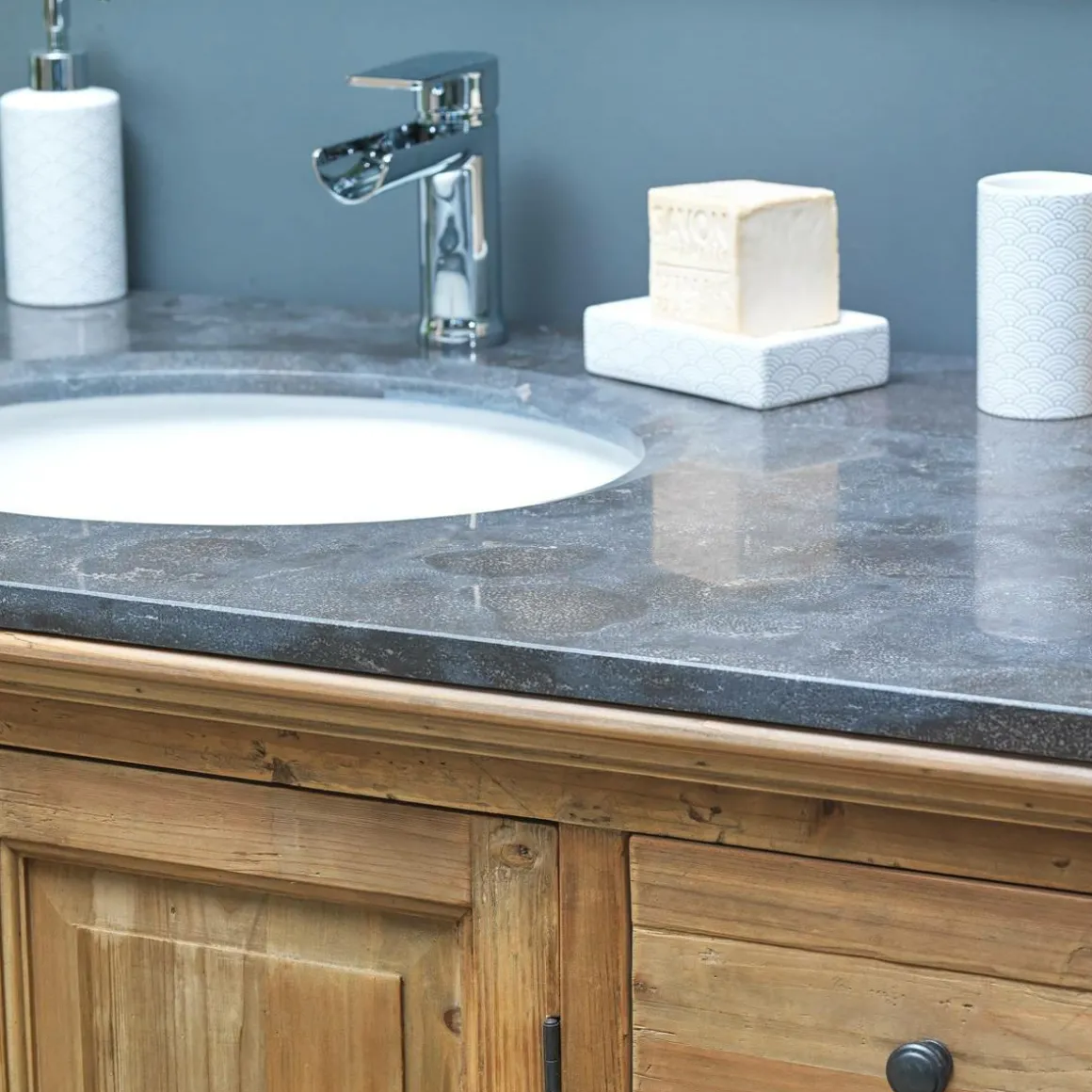 Vous apprécierez le généreux espace de rangement que procurent ses 2 portes centrales, ses 2 tiroirs, et sa trappe ainsi que la qualité de ses finitions et de son plateau en pierre bleue de Chine. Ce meuble salle de bain bois massif pourra facilement s’adapter à une salle de bain moderne ou classique grâce à sa finition naturelle