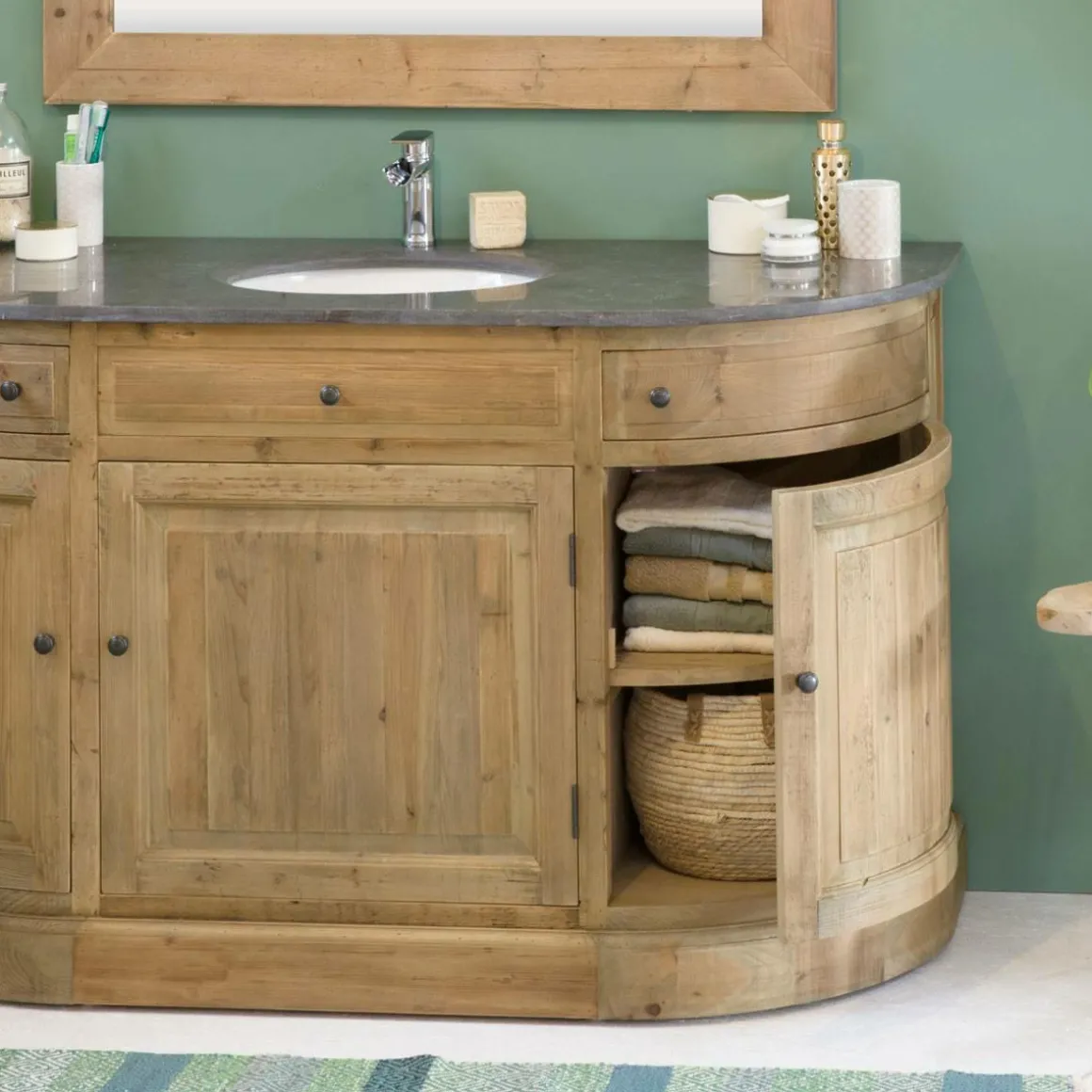 Ce magnifique meuble de salle de bain en bois massif aux formes arrondies apportera à votre intérieur un charme authentique grâce à son vieux pin recyclé, son plateau en pierre bleue de Chine et sa vasque en porcelaine. Les nuances claires de son bois recyclé vous permettront de l’associer sans difficulté à différents univers déco.