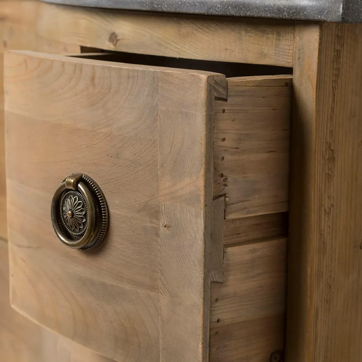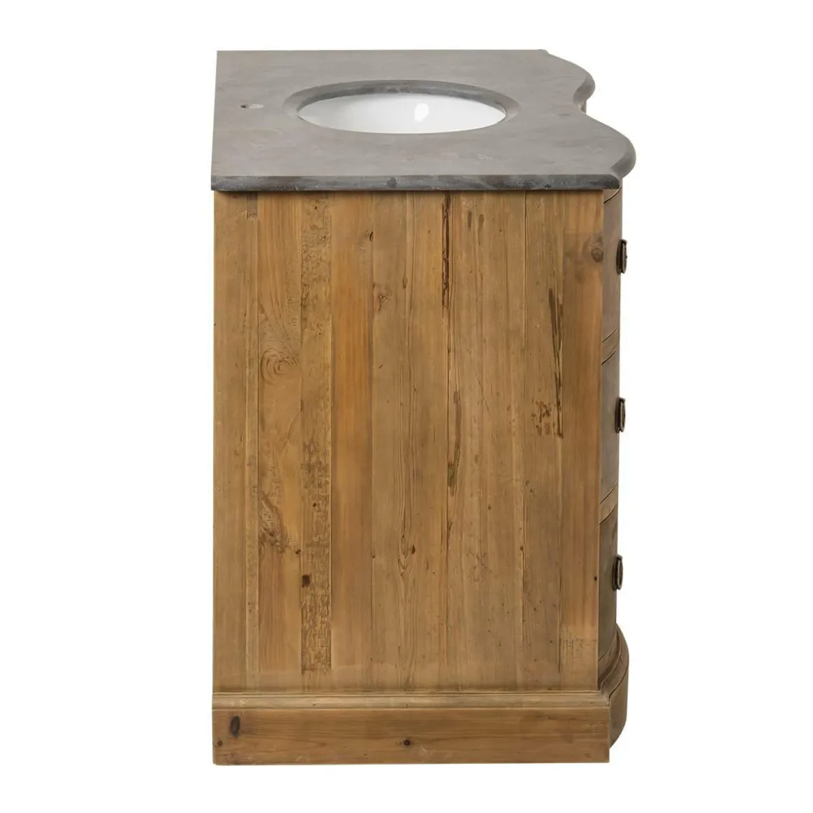 Aux formes galbées et arrondies, ce meuble salle de bain en bois massif est l’alliance parfaite entre le bois de pin recyclé et de la pierre bleue naturelle de Chine. Appréciez le design atypique de ce meuble ainsi que ses détails et finitions. L’originalité des poignées apportent un charme supplémentaire.