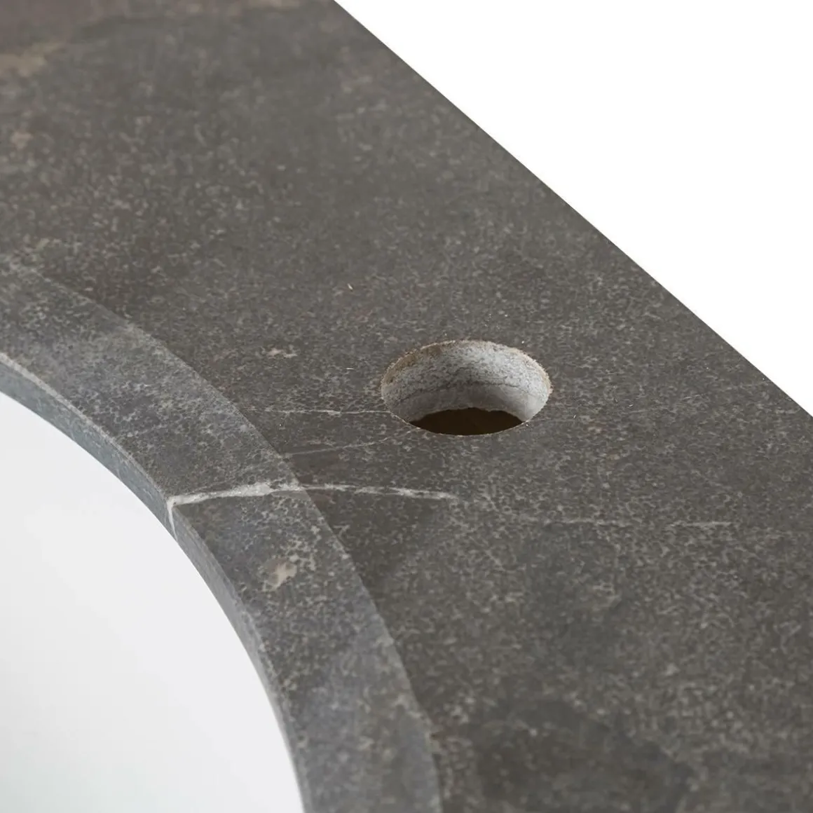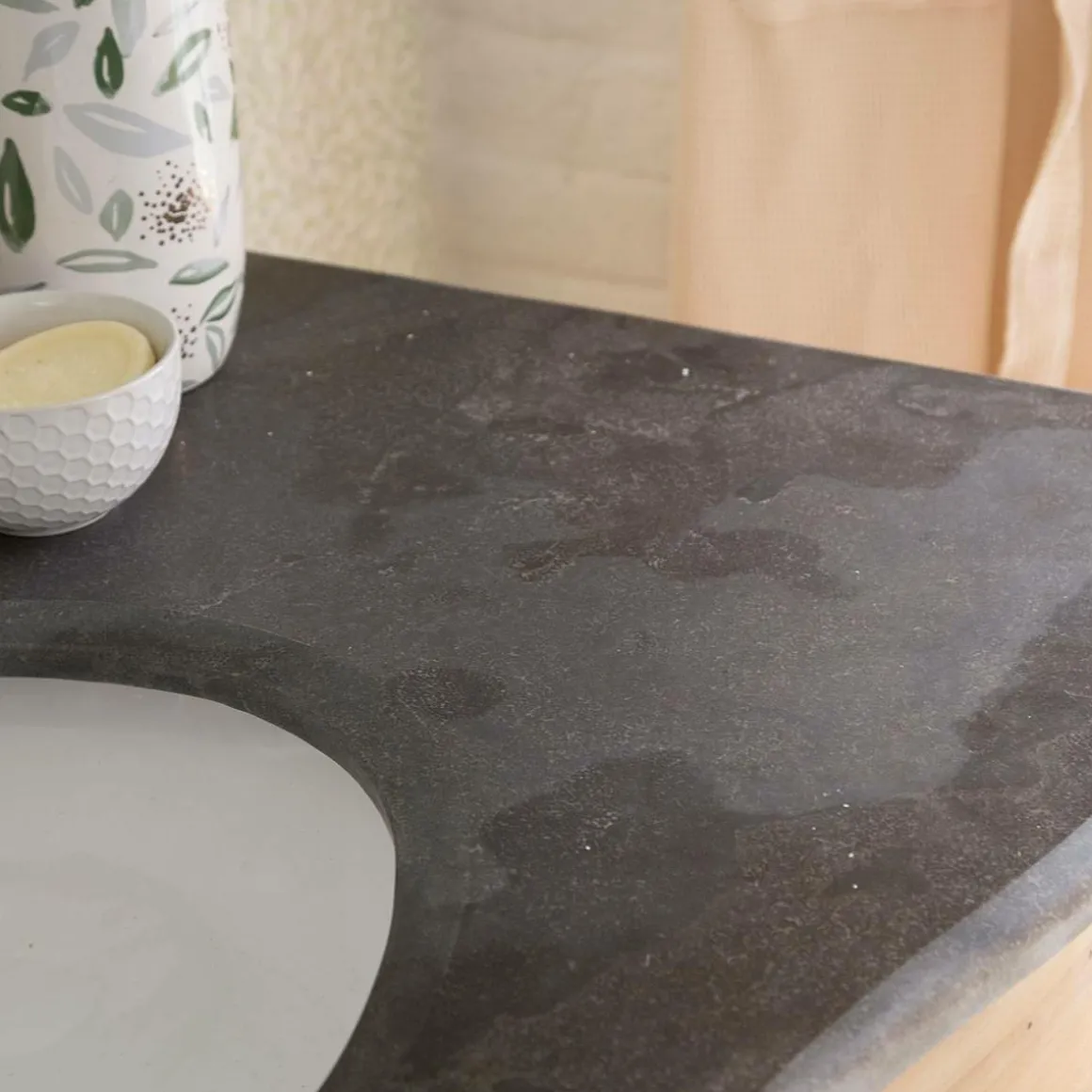 Ce meuble est fourni avec sa vasque. Livré en 2 parties : partie basse + plateau en pierre bleue de Chine avec vasque intégrée.