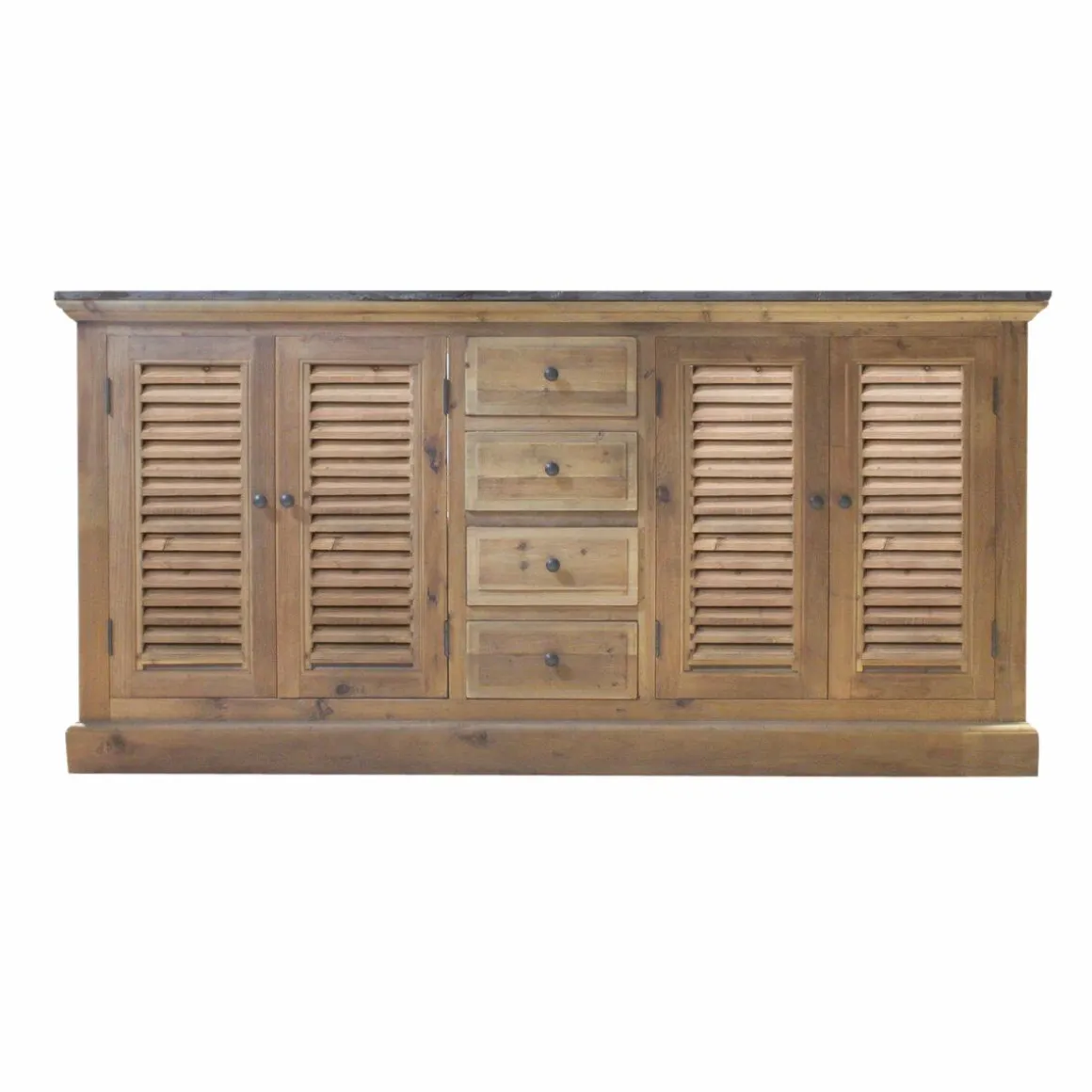 Ce meuble de salle de bain en bois massif propose un design épuré qui allie tout aussi bien son plateau en pierre bleue de Chine que le vieux pin recyclé. Vous allez craquer pour ses vasques en porcelaine qui nous rappelle les meubles d’autrefois ! Composé de quatre portes ainsi que de quatre tiroirs centraux, ce meuble vous offre tout l’espace nécessaire pour ranger et stocker vos affaires.