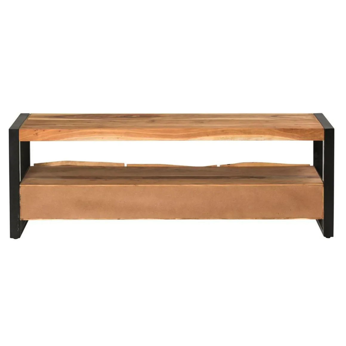 Côté matériaux, on retrouve le bois d’acacia qu’on reconnait très facilement grâce à ses nuances foncées. L’alliance entre ce bois massif et le métal en fait un meuble de caractère qu’on ne retrouve pas partout. Côté fonctionnalité, on a pensé à toutes les teams. Doubles plateaux pour disposer les box et consoles ainsi que les objets de déco. Triples tiroirs pour cacher le matériel, les télécommandes, les ordinateurs…