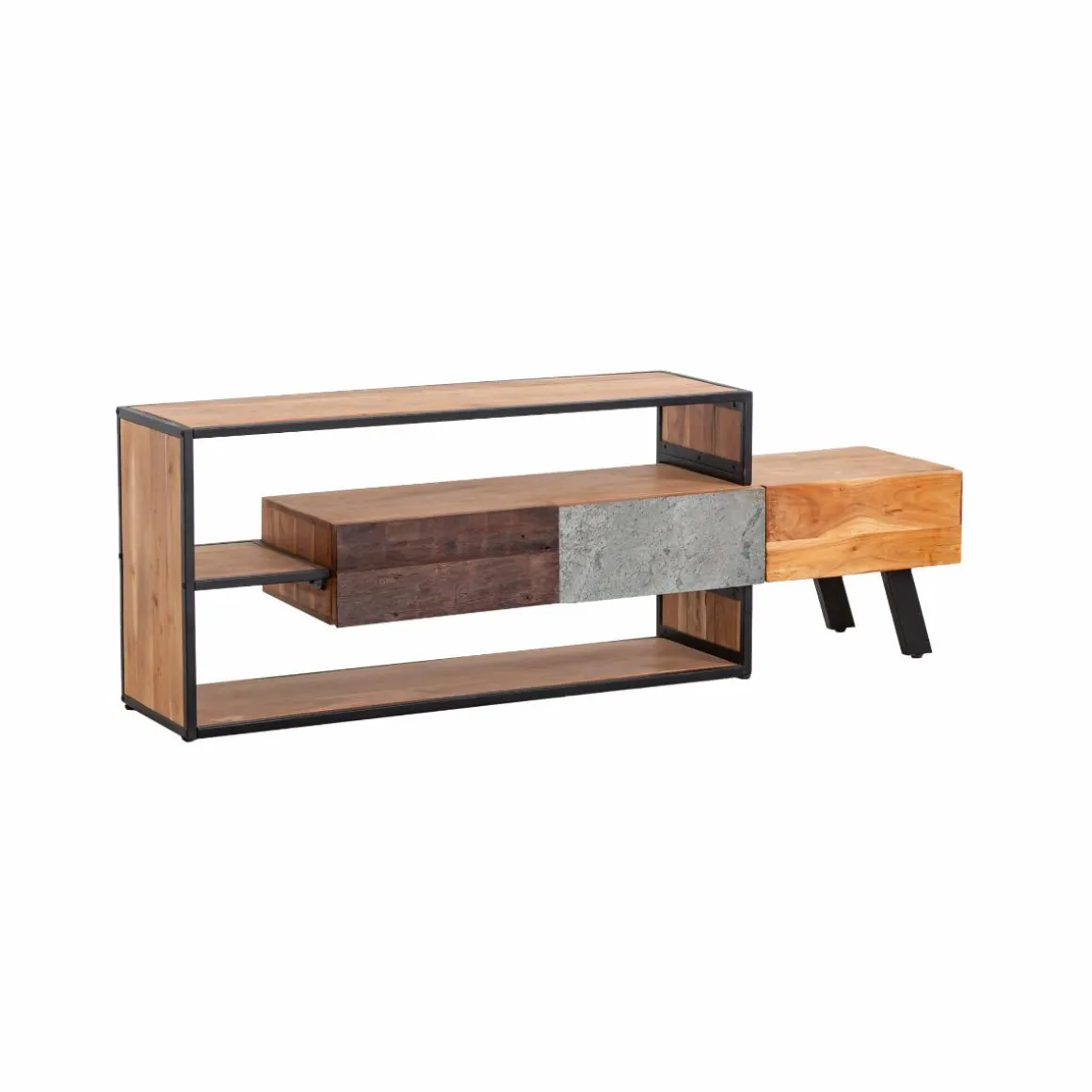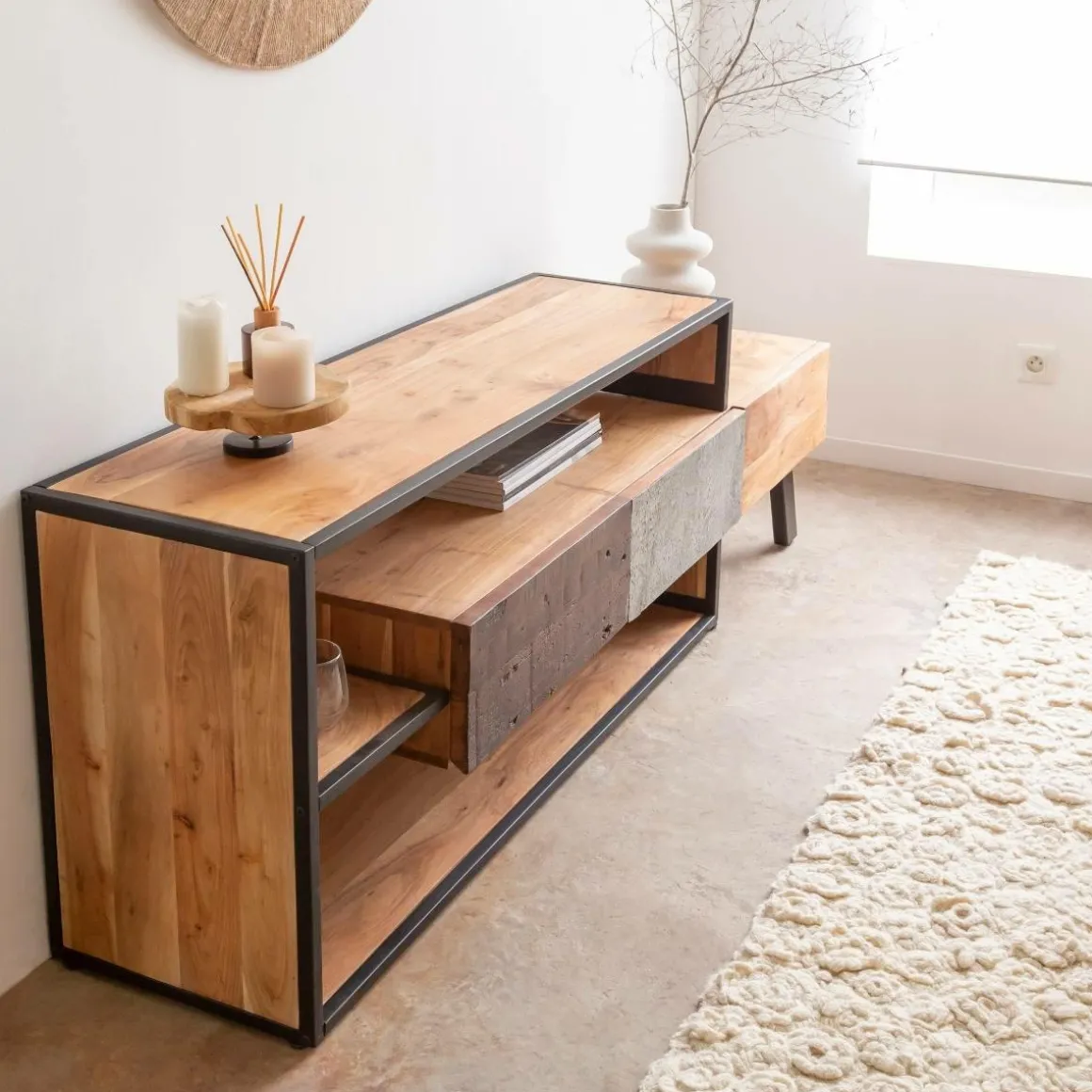 En apportant une touche de modernité à votre espace de vie, le meuble TV en bois d’acacia Ernest est le moyen idéal de mettre en valeur votre espace de divertissement. Fabriqué dans un magnifique bois d’acacia, ce meuble élégant comporte trois tiroirs aux couleurs distinctes qui apporteront une touche de couleur et de fantaisie à n’importe quelle pièce.