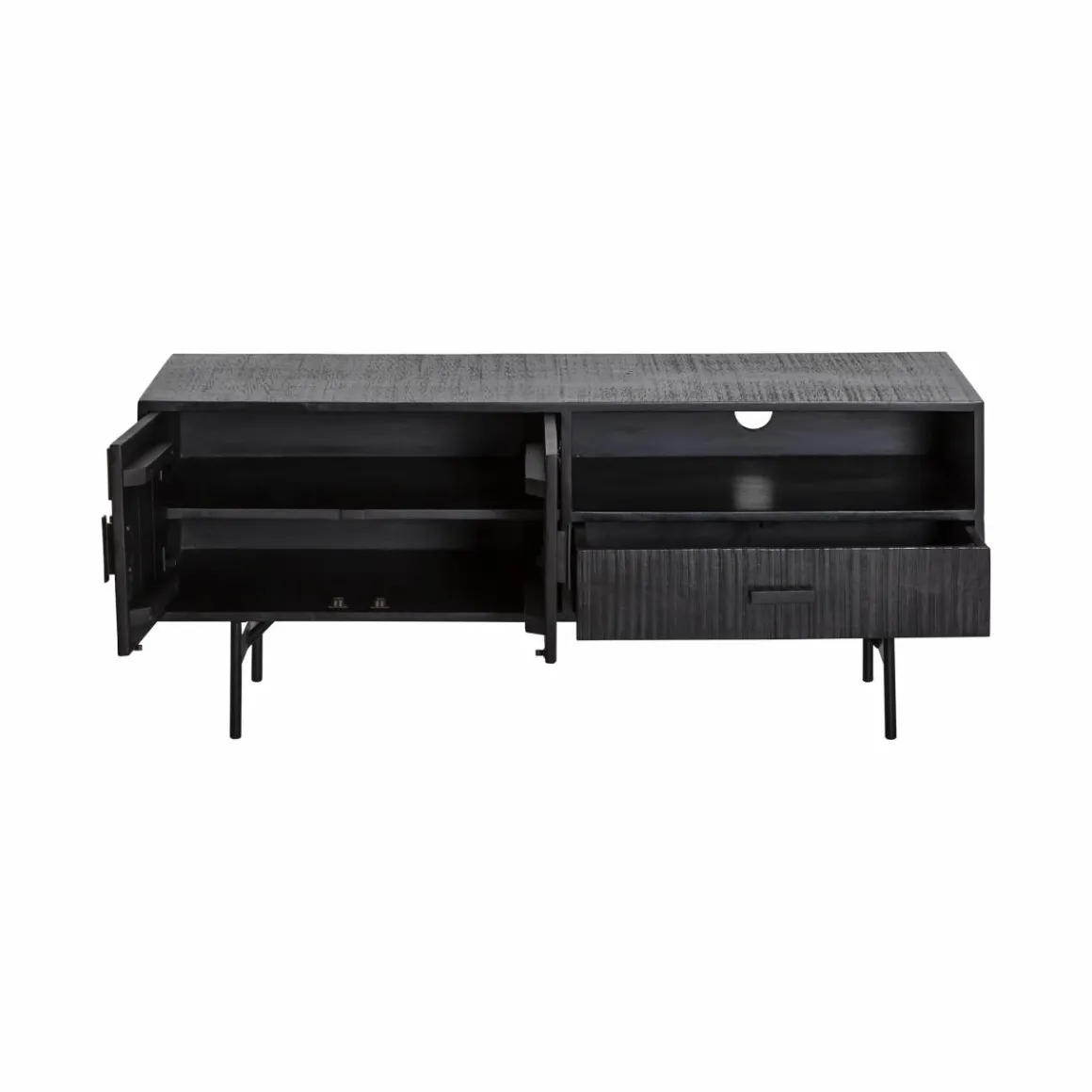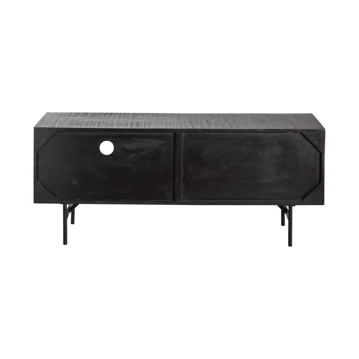Ce meuble est robuste grâce à sa conception 100% bois. Il a été choisi de revêtir le bois d’une peinture noire et d’jouter un piétement métal. Pas de doute, on est dans l’esprit indus et on adore ça !