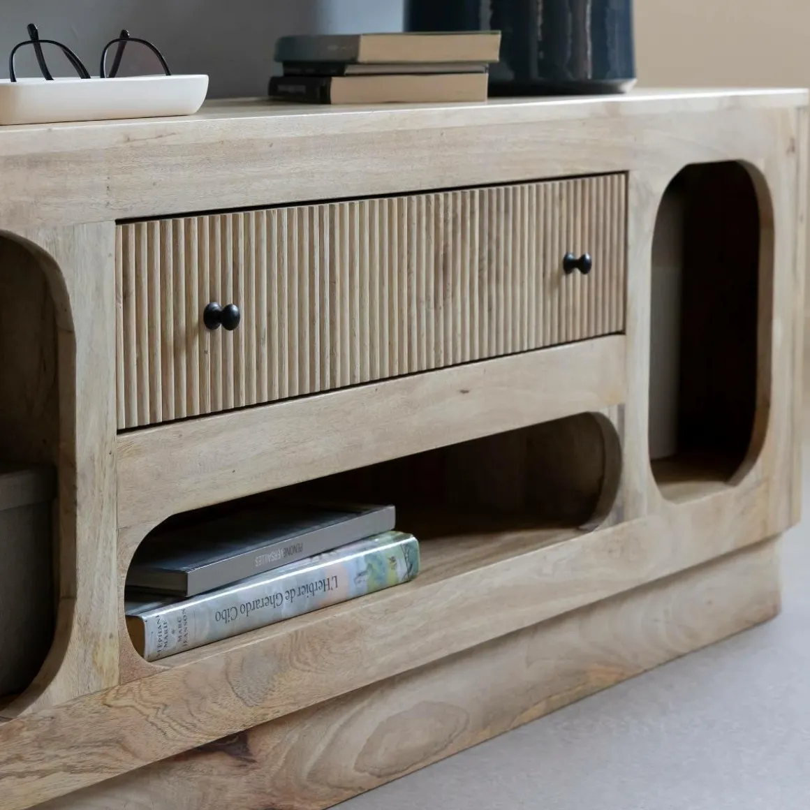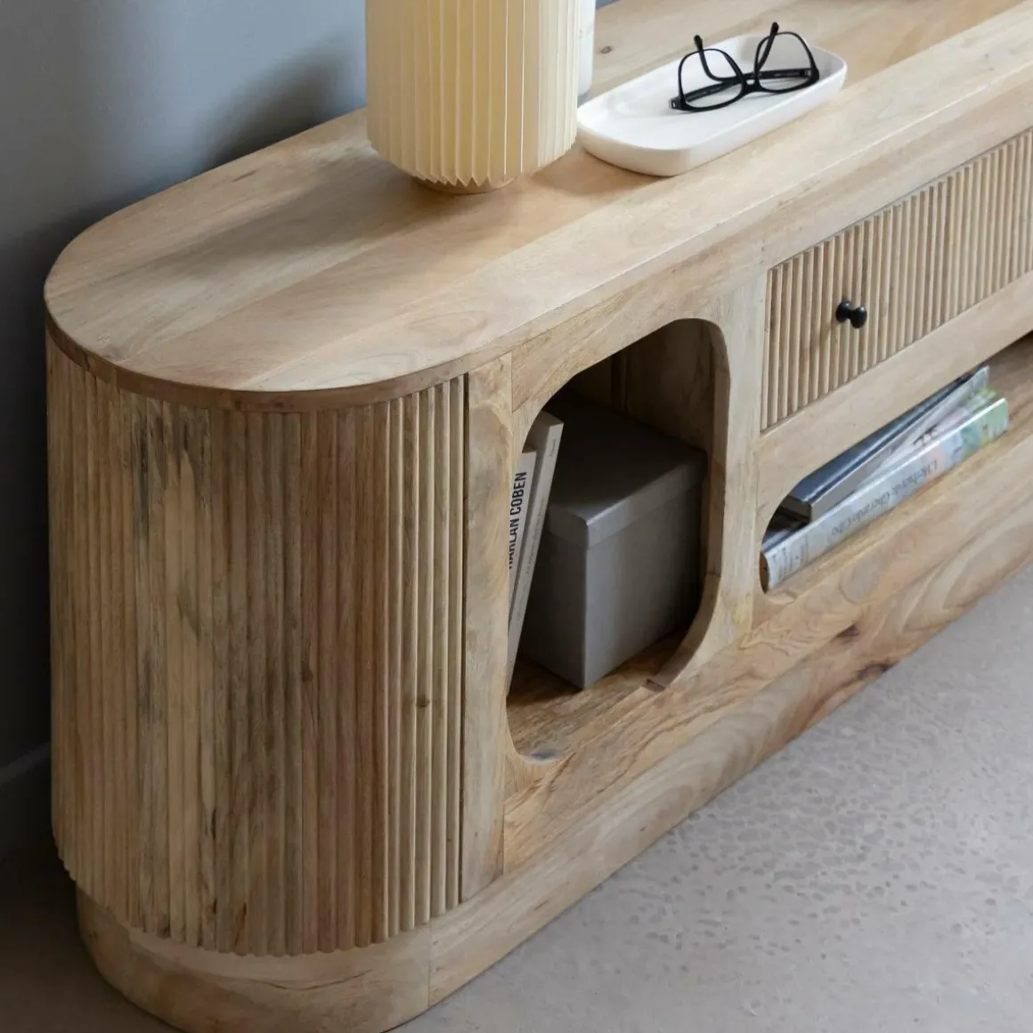 Ce meuble TV en bois de manguier blanchi séduit par son design arrondi et ses lignes douces qui lui confèrent une allure contemporaine et élégante. Sa finition blanchie met en valeur les nuances naturelles du bois tout en apportant luminosité et légèreté à votre intérieur. Avec son style original, il devient une véritable pièce décorative tout en restant fonctionnel.