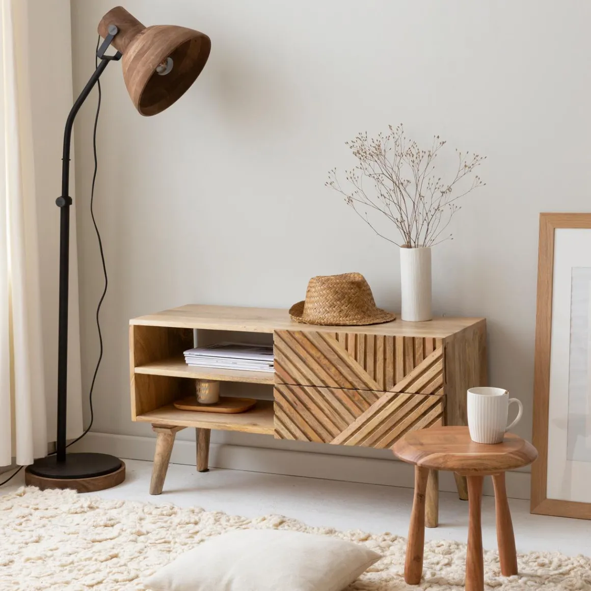 Amateurs de mobilier contemporain, ce meuble TV est fait pour vous ! On retrouve du bois massif, un design linéaire sur la façade de porte, des nuances lumineuses et un piétement compas ! What else ?