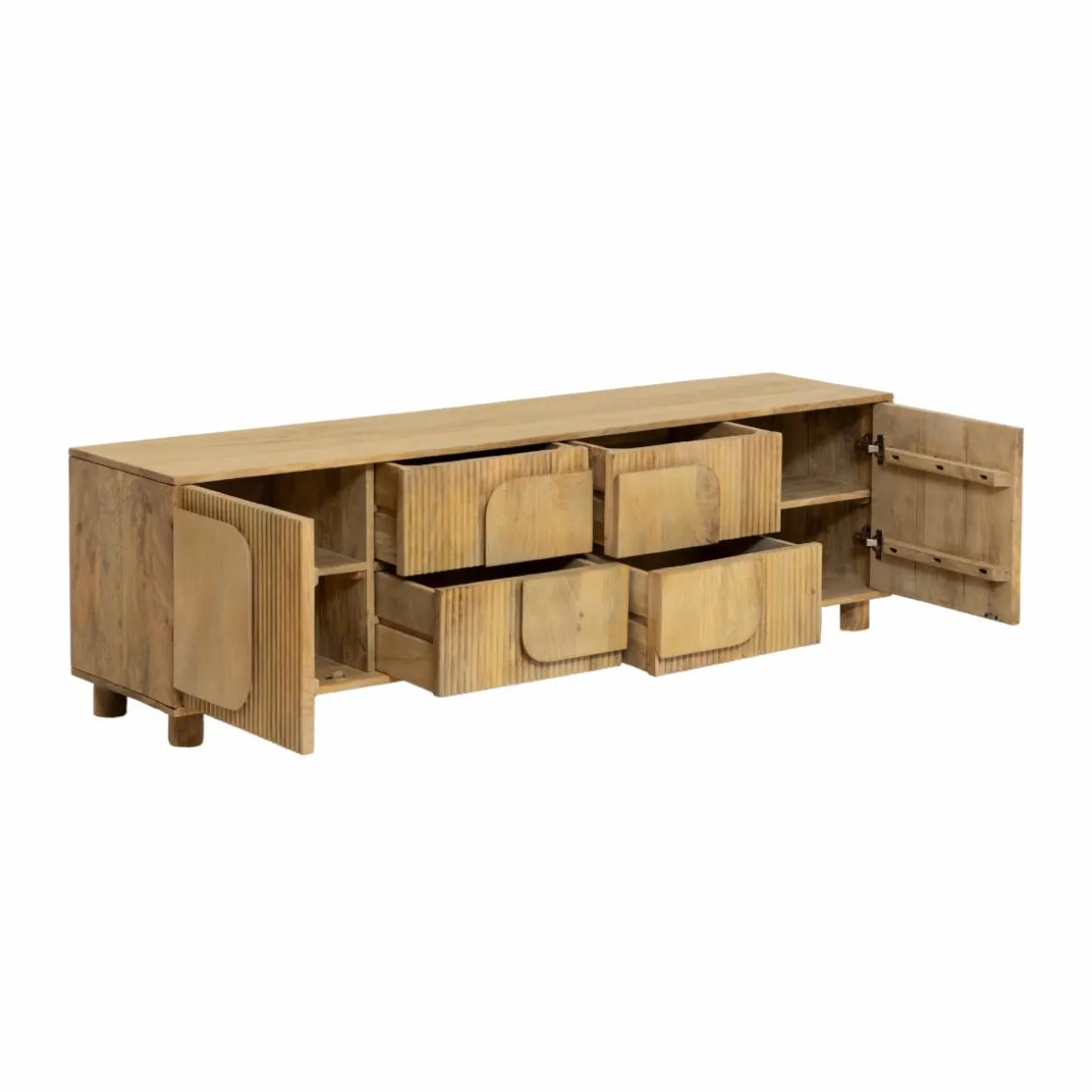 Faites place au design graphique et chaleureux avec ce meuble TV Eros, réalisé en manguier massif et pensé pour structurer votre espace tout en douceur. Il se distingue par ses façades sculptées, où les formes pleines et les lignes rainurées s’entrelacent dans un équilibre parfait.