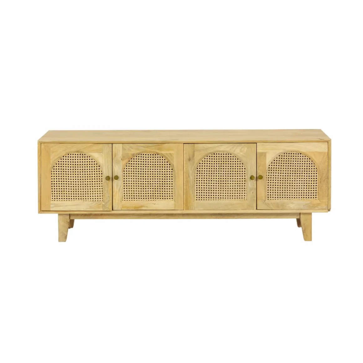 Alliez charme authentique et esprit graphique avec ce meuble TV en manguier et cannage, pensé pour apporter chaleur et élégance à votre salon. Avec ses portes ornées de cannage en fibres tressées encadrées par des arches sculptées, il évoque l’artisanat traditionnel revisité par un design contemporain.