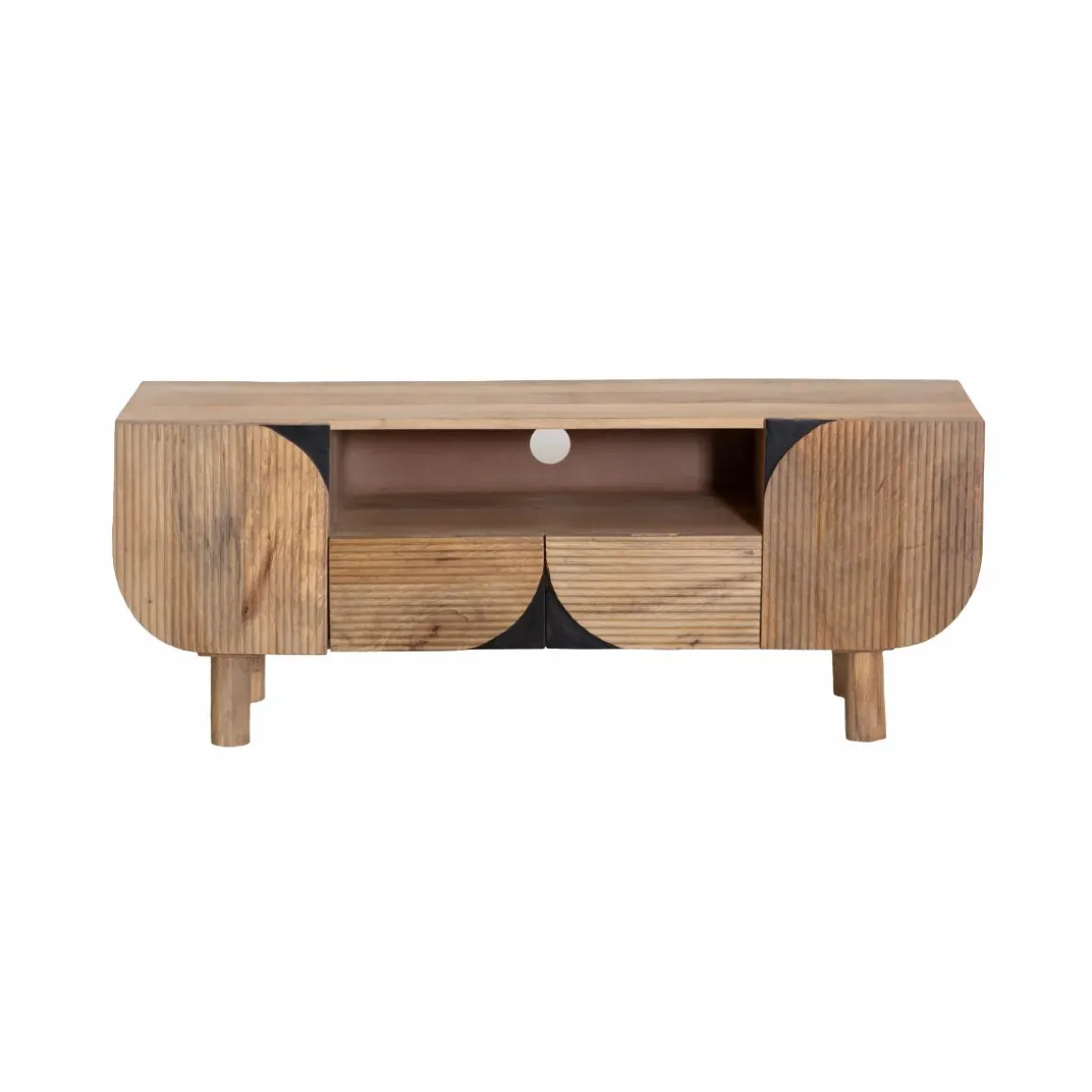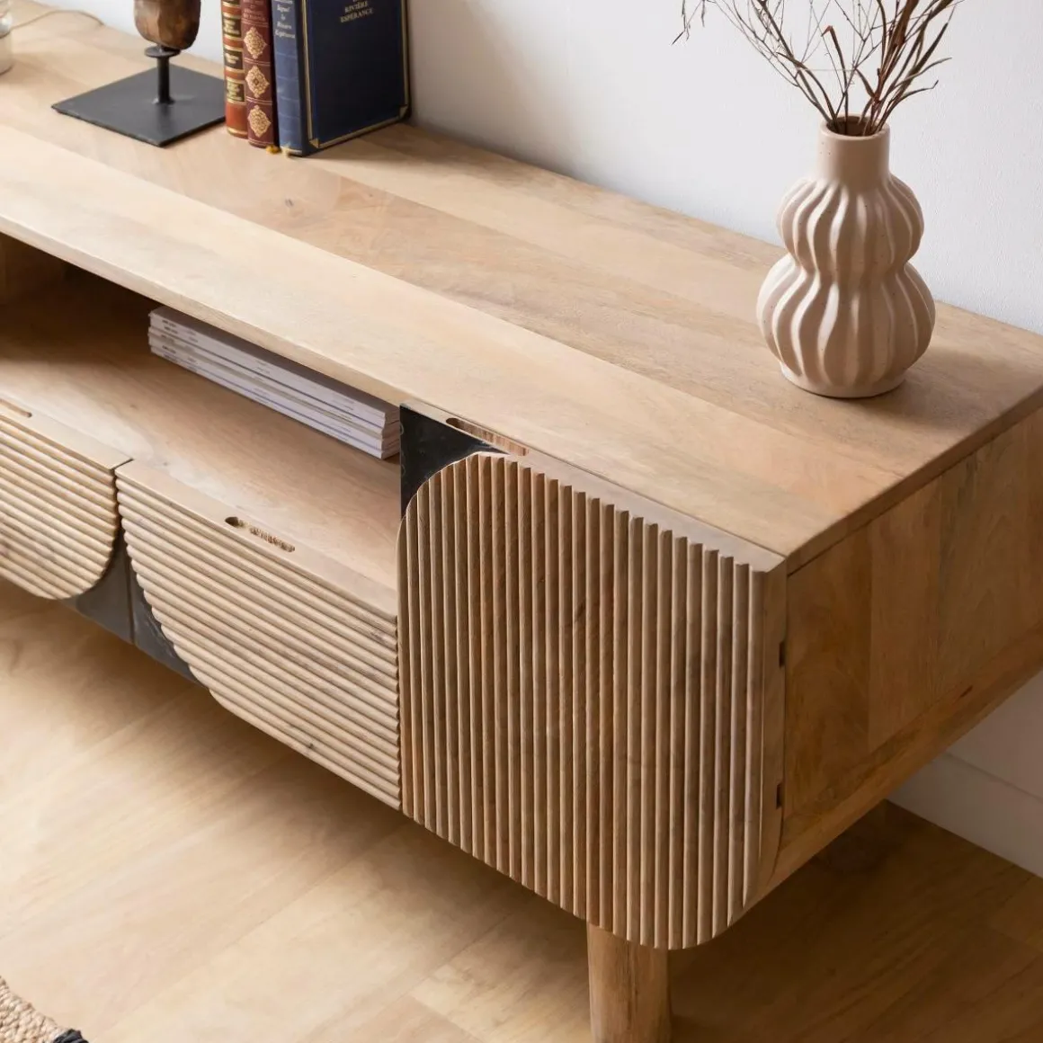 Le meuble TV Loëvan est un meuble emblématique qui met en valeur la beauté et la polyvalence du bois de manguier. Le design intemporel présente une forme classique avec des portes arrondies, créant un look délicat mais accrocheur. L’effet baguette ajoute au charme esthétique, faisant de ce meuble un complément attrayant à tout espace de vie.