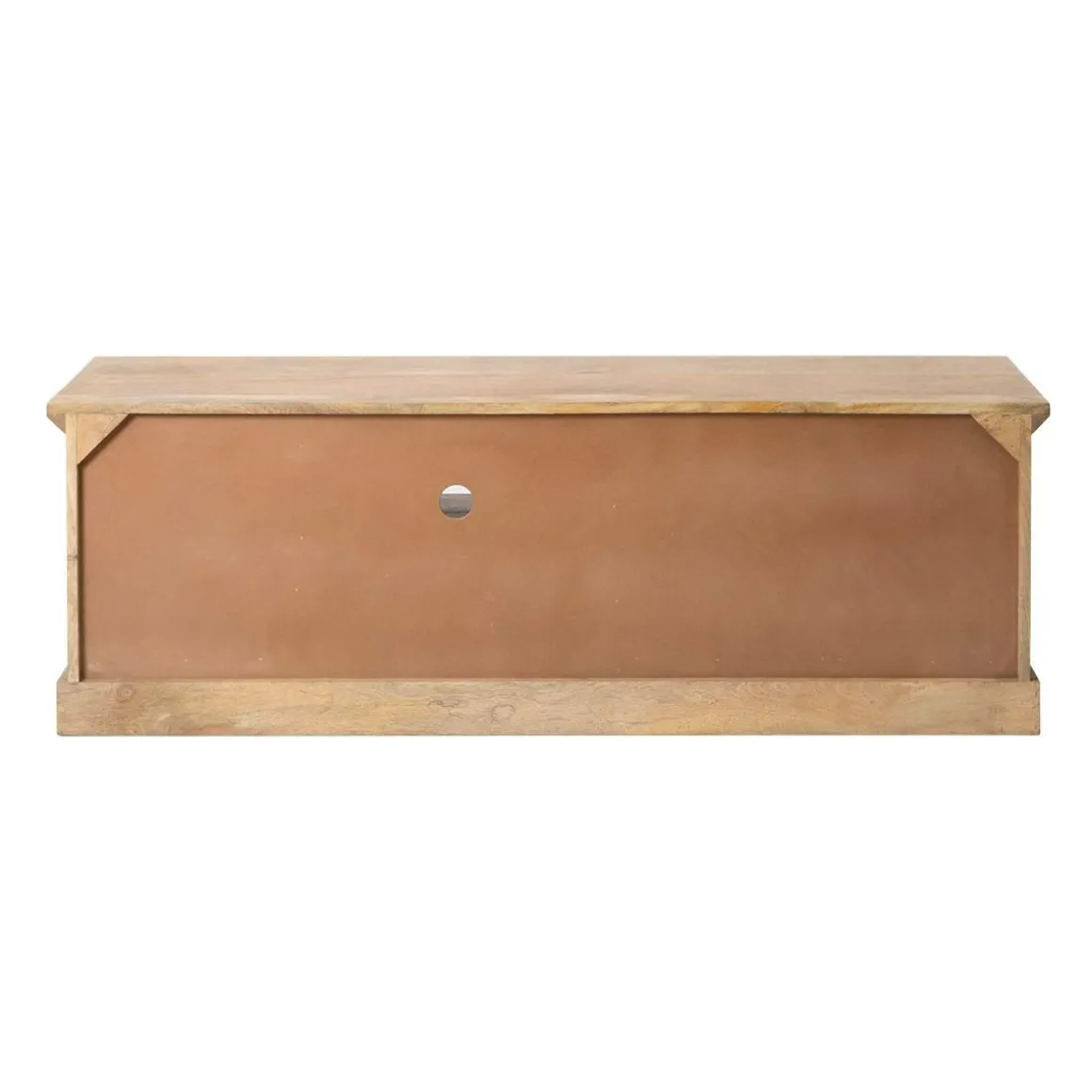 Ce meuble TV dispose d’un design bi-matière qui est très bien équilibré. Il allie le bois de manguier qui est un bois très lumineux au métal gris. Le métal est ajouré de façon à simplifier et alléger les traits parfois trop durs de ce matériau. On aime son design sublimé par de jolis motifs. Le choix des matériaux et des coloris est très bien dosé et harmonise l’ensemble du meuble.