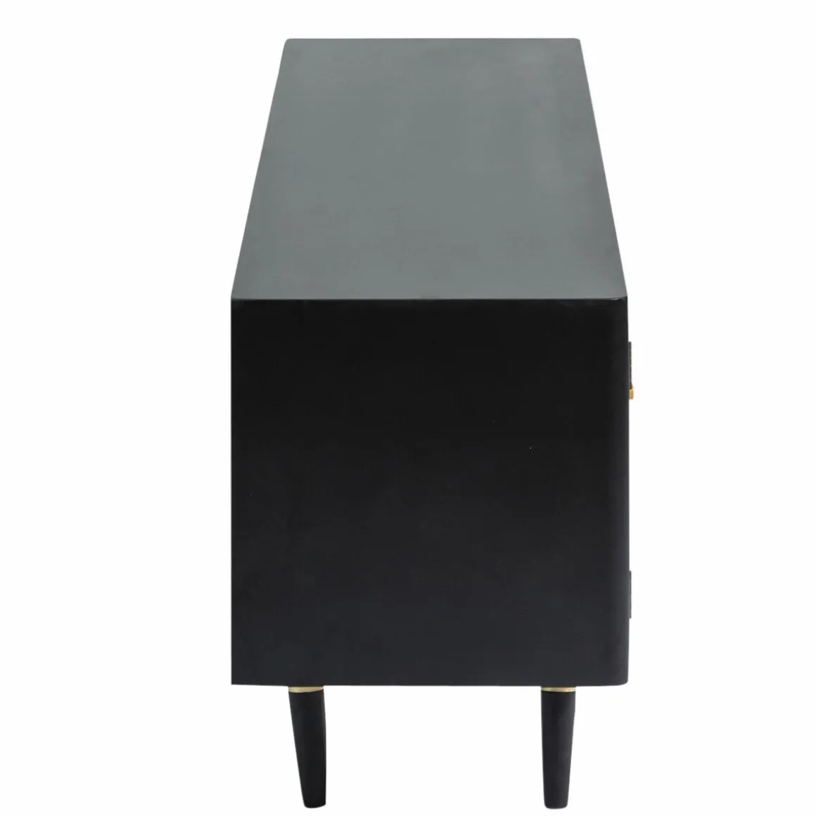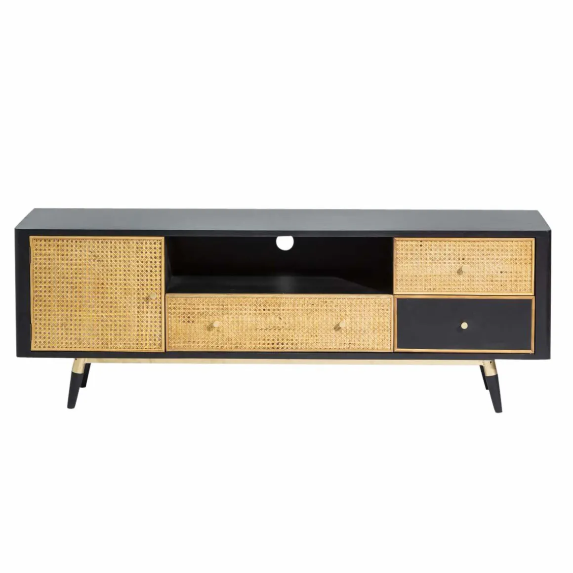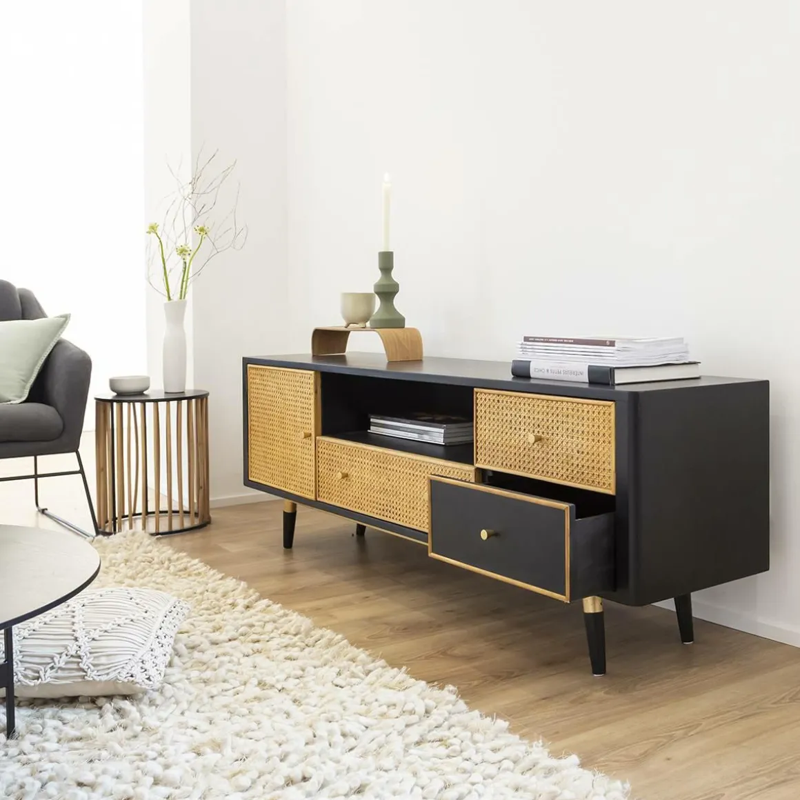 Ce meuble TV scandinave est conçu à partir de MDF, de métal noir, mais aussi de cannage. Une matière qui est actuellement au top des tendances déco ! Ainsi, il trouvera facilement sa place dans votre salon et il s’adaptera autant dans un intérieur au style industriel que bohème. Son petit plus ? Ses poignées en métal couleur laiton ! Originalité et vintage sont sans aucun doute les maîtres mots pour qualifier ce meuble.