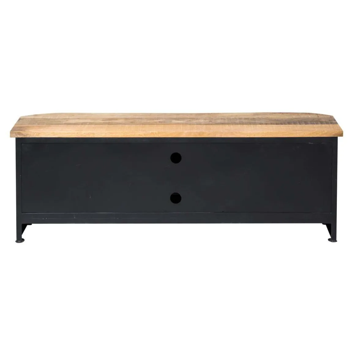 Il est une belle association entre le bois de manguier et le métal noir. Ses 3 portes battantes aimantées offrent un bel espace de rangement organisé à l’aide d’étagères. Son petit plus, vous pourrez ranger vos box au niveau de la porte centrale, de cette façon elles seront cachées et le passe câble prévu facilitera les branchements.