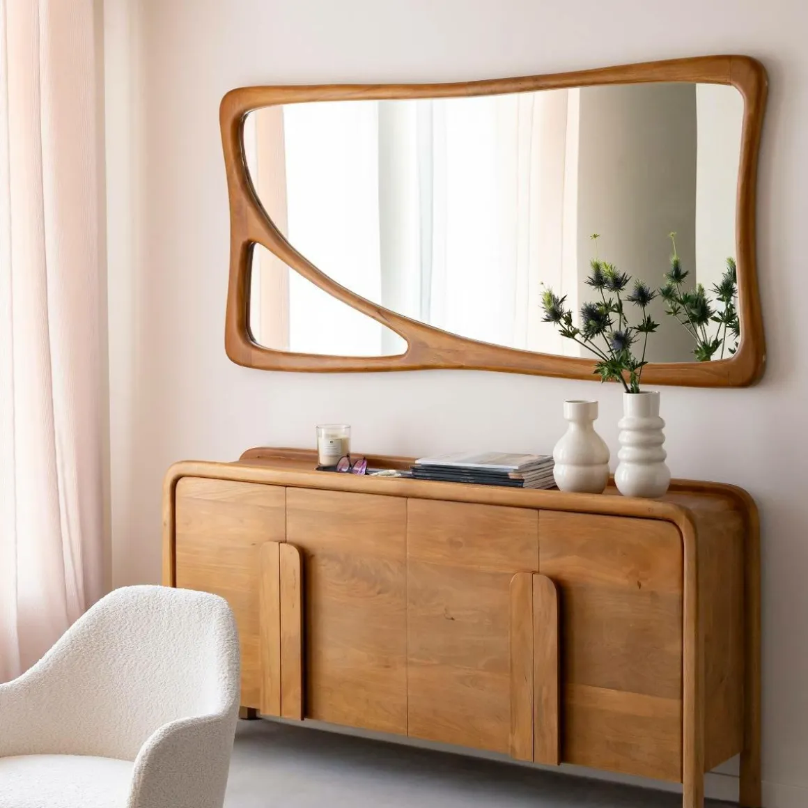 Idéal au-dessus d’un buffet, dans une entrée ou dans un salon, ce miroir horizontal capte la lumière et agrandit visuellement l’espace. Sa silhouette irrégulière, à mi-chemin entre art mural et objet fonctionnel, en fait un véritable coup de cœur déco.