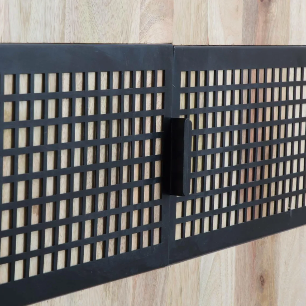 Crée en bois de manguier massif et métal noir, ce buffet s’appuie sur des bandes grillagées en métal pour se démarquer et proposer un meuble original. Pensé afin de faciliter votre organisation et votre rangement au quotidien, il vous propose 4 compartiments définis où vous pourrez stocker votre vaisselle ou vos bouquins.
