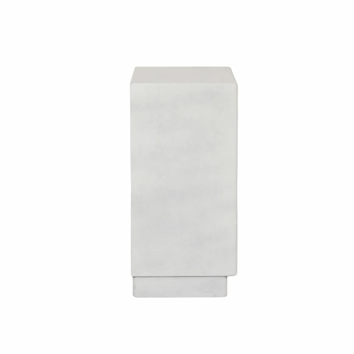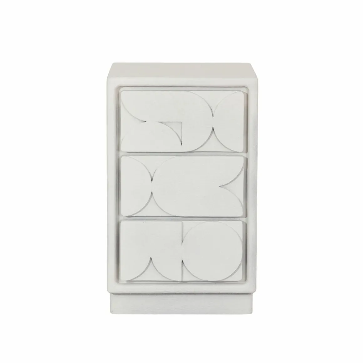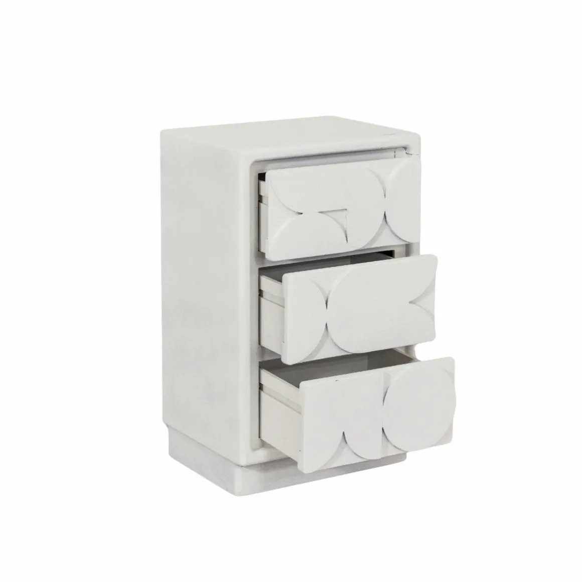 Sa finition brute au toucher légèrement granuleux évoque les matériaux naturels, tout en offrant une grande résistance et un entretien simplifié. Les trois tiroirs offrent une belle capacité de rangement, idéale pour le linge, les accessoires ou les papiers du quotidien. Sa base rectangulaire renforce la stabilité et accentue son allure monolithique.