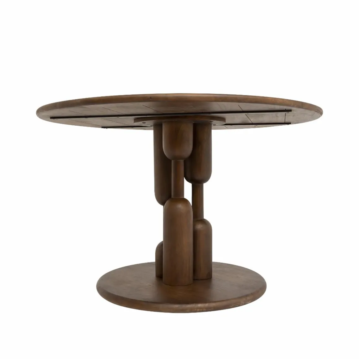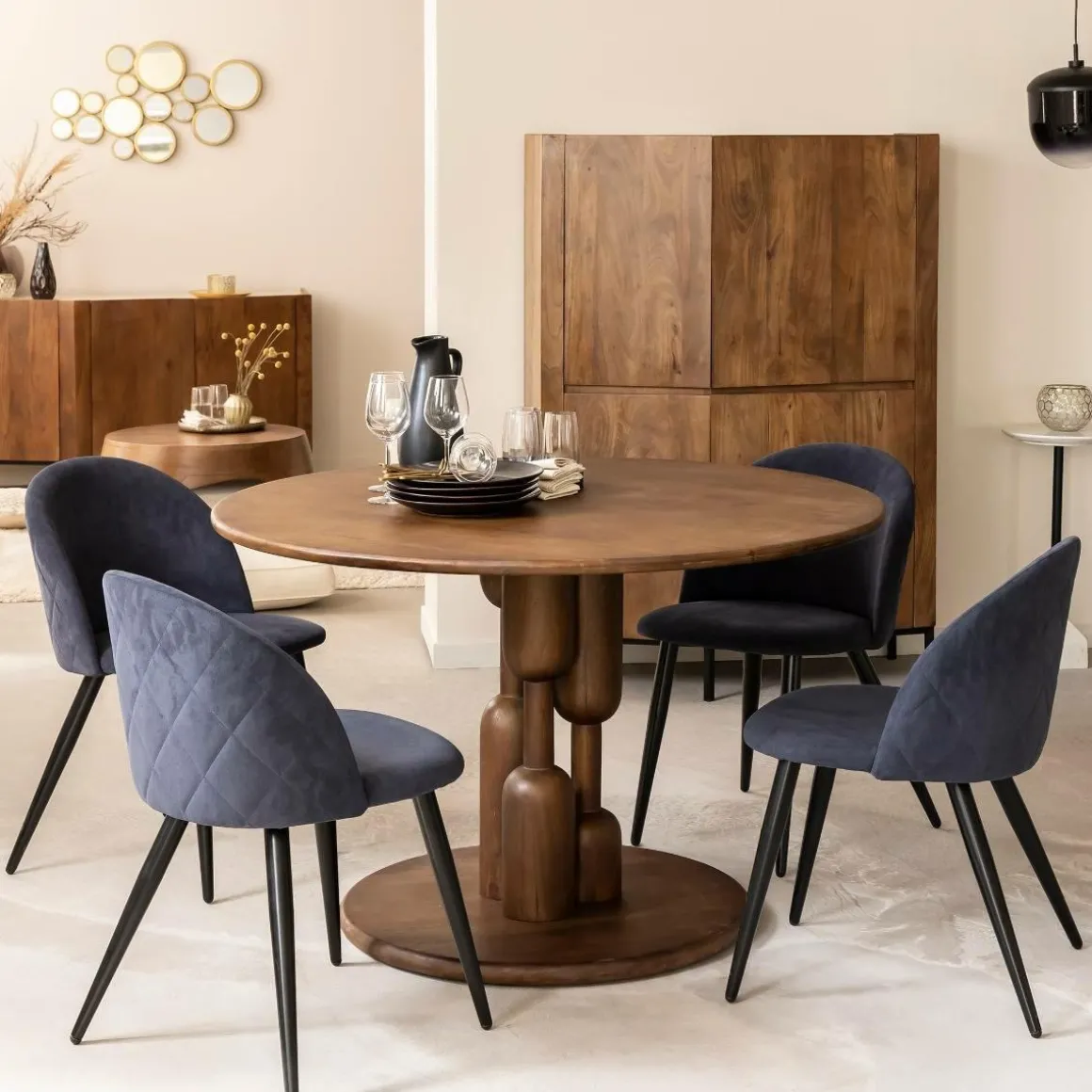 Avec un plateau rond en bois foncé de 120cm de diamètre et une hauteur de 77cm, cette table offre un espace généreux pour accueillir confortablement jusqu’à six personnes. Idéale pour les repas en famille ou entre amis, elle combine élégance et fonctionnalité.