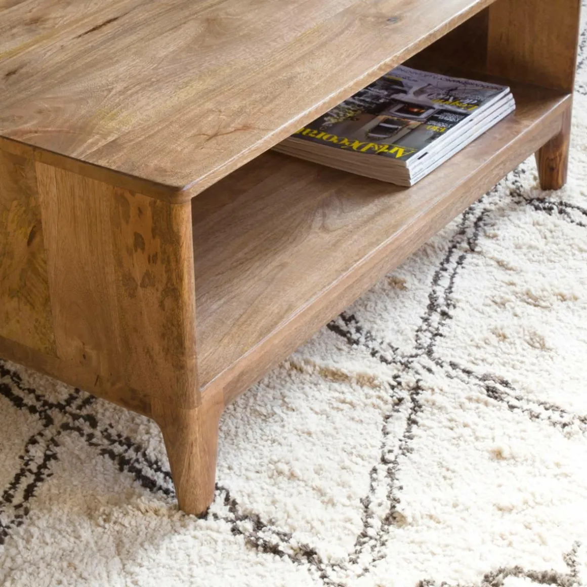 Cette table basse bois massif est conçue à partir d’un matériau chaud qu’on aime beaucoup ; à savoir le manguier. Sa particularité ici est sa teinte. Elle a été travaillé de façon à foncer ses nuances pour se rapprocher d’un bois tel que le merisier ou le noyer. Ses poignées en métal gris sont très joliment mises en valeur grâce au contraste entre les deux matériaux.