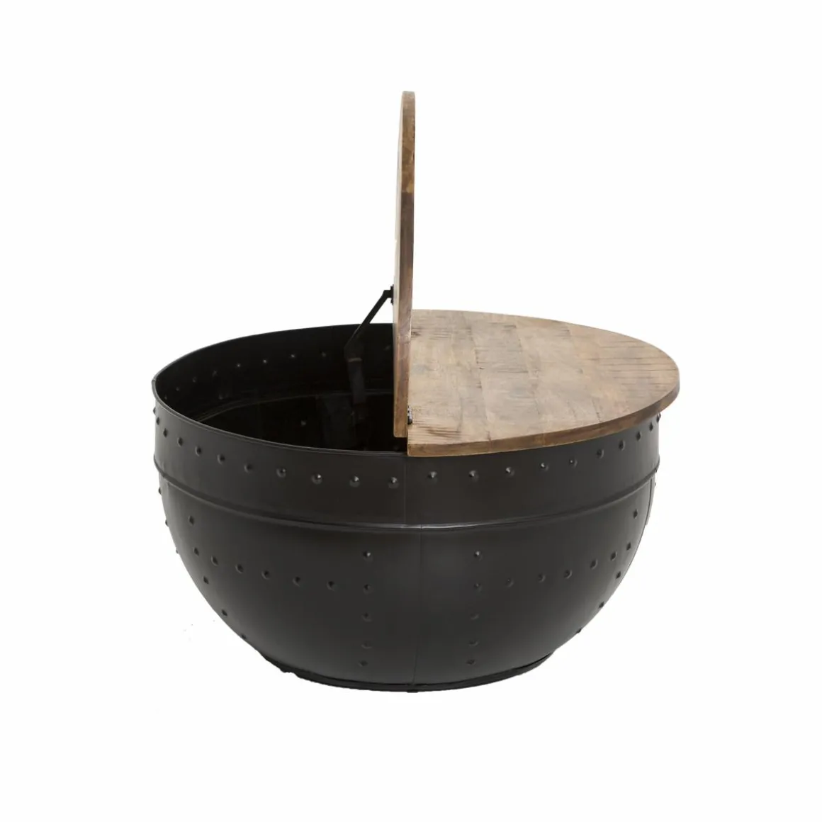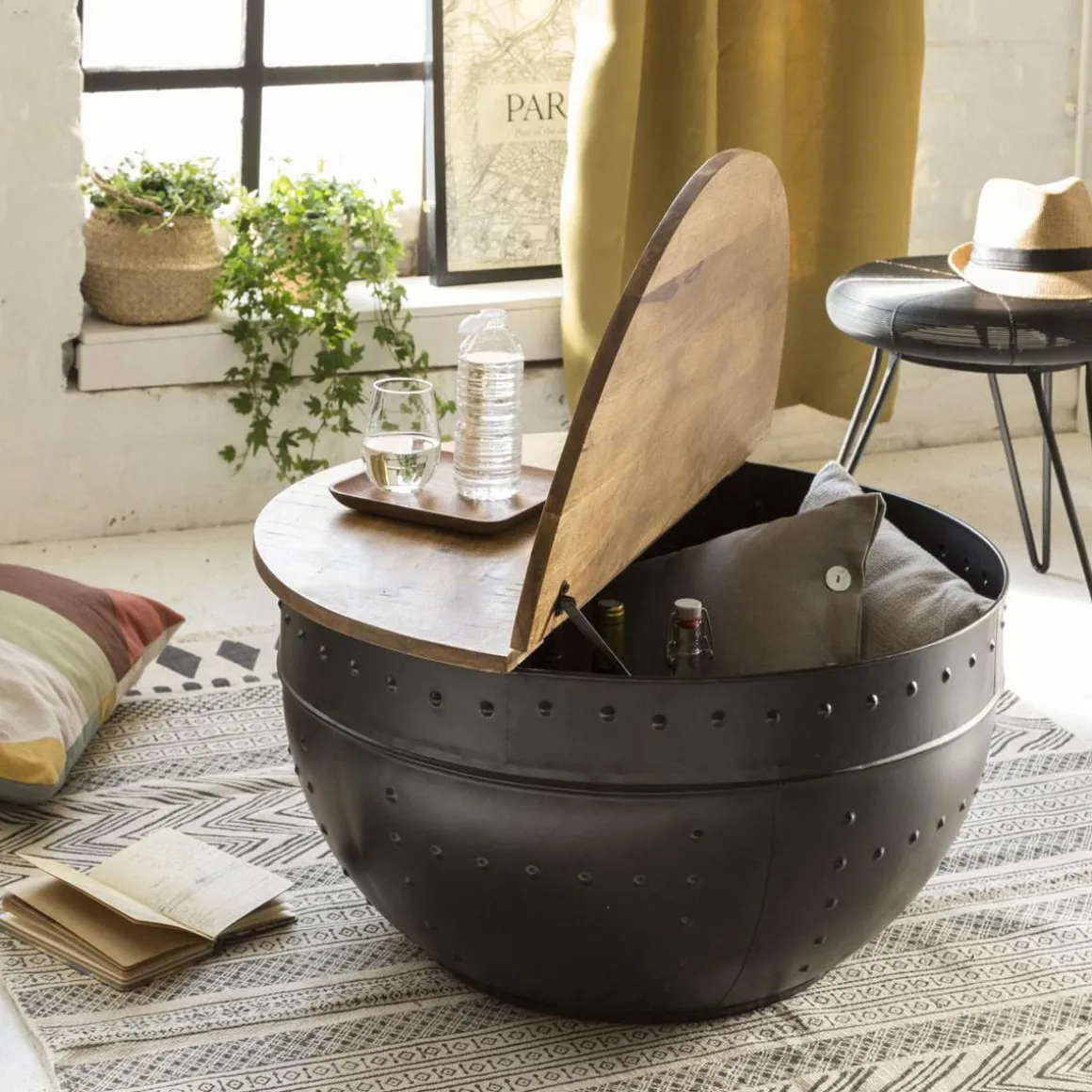 Avis aux amateurs du mobilier original, vous allez vous retrouver à travers cette table basse ! Elle est l’originalité incarnée ! Conçue en métal noir, elle a l’allure d’un bol quand on la regarde de loin. En s’approchant, on découvre que son plateau loge un espace de rangement très appréciable, on aperçoit l’effet clouté révélateur de la tendance industrielle ainsi que les nuances vives et lumineuses de son bois de manguier ; un sans-faute, une valeur sûre !