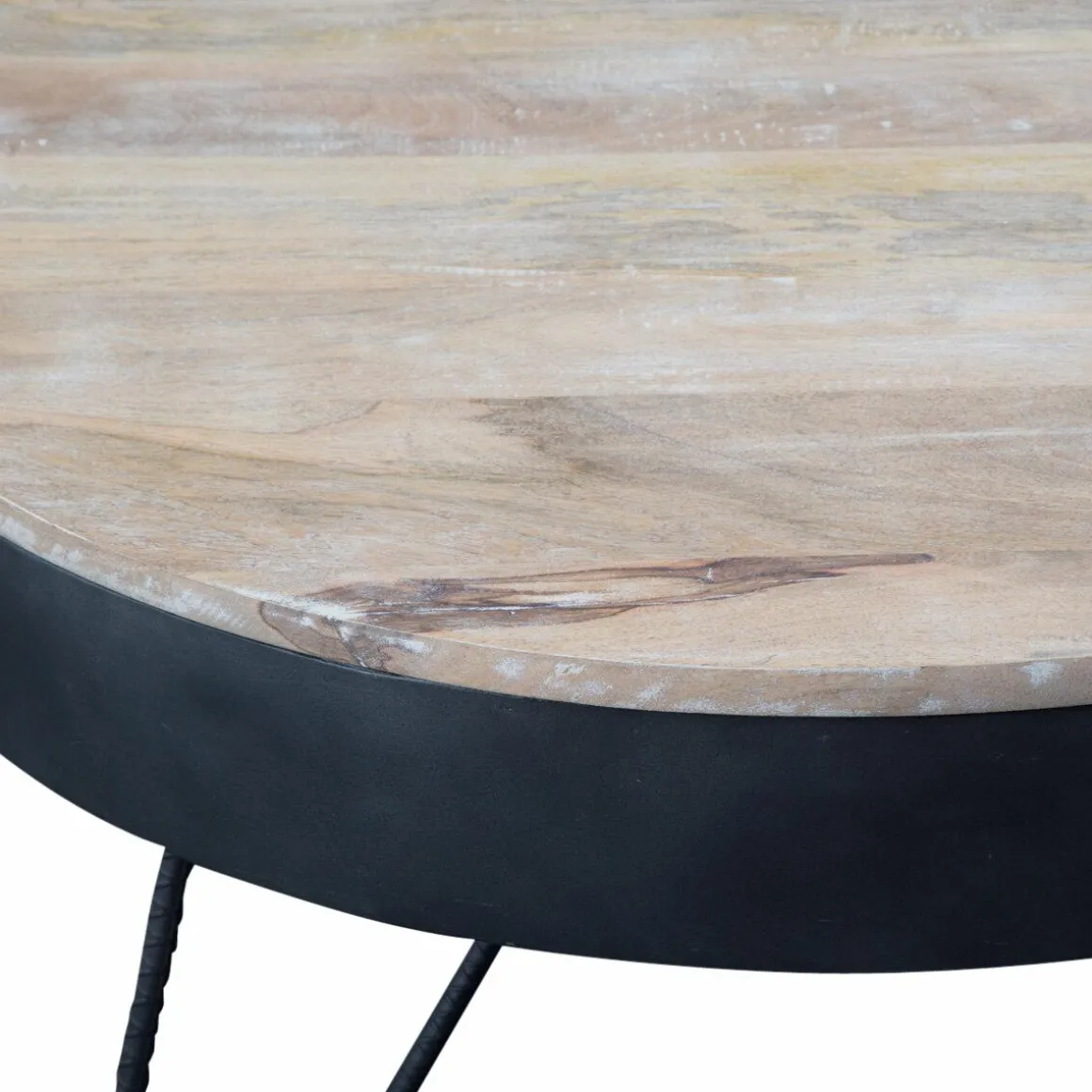 Cette table basse industrielle doit ses nuances claires et lumineuses à son bois exotique. On aime le rendu harmonieux entre le plateau en manguier blanchi et le cerclage marqué en métal gris qui l’entoure. A cela, est ajouté un piétement compas en métal doté d’une finition très raffinée. L’ensemble en fait une table coup de cœur !