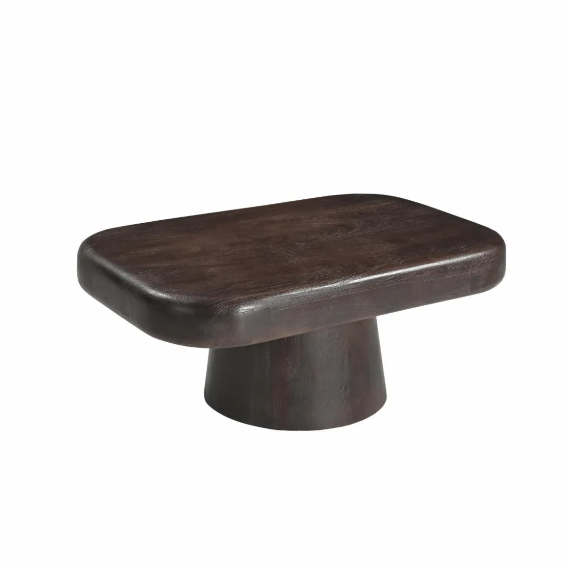 Cette table basse en bois de manguier foncé de la collection Liriel séduit par son design sculptural et raffiné. Son plateau rectangulaire aux angles arrondis repose sur un pied central conique, lui conférant une allure moderne et élégante. La teinte foncée du bois met en valeur ses veines naturelles et apporte une atmosphère chaleureuse et sophistiquée au salon.