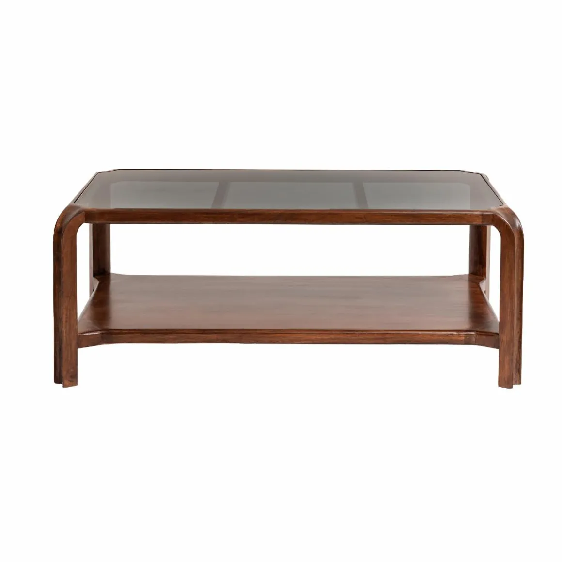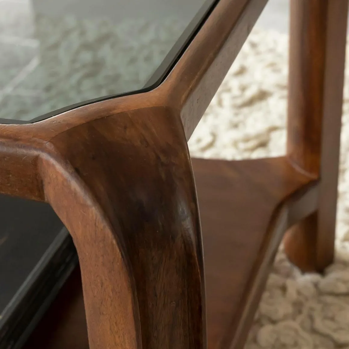 Fabriquée en bois de manguier de première qualité, elle présente un plateau en verre teinté noir qui ajoute une élégance subtile à son allure. Sa forme originale lui confère un caractère unique et captivant, faisant de cette table basse un véritable point focal dans votre salon.